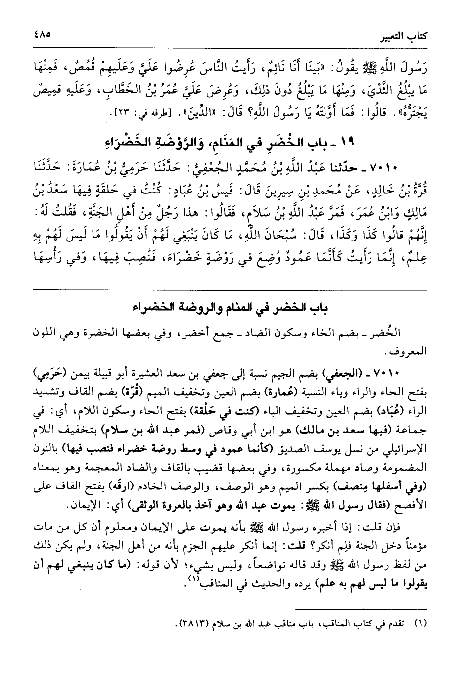 7010 - (الجعفي) بضم الجيم نسبة إلى جعفي بن سعد العشيرة أبو قبيلة بيمن (حَرَمِي) بفتح الحاء والراء وياء النسبة (عُمارة) بضم العين وتخفيف الميم (قُرّة) بضم القاف وتشديد الراء (عُبَاد) بضم العين وتخفيف الباء (كنت في حَلْقة) بفتح الحاء وسكون اللام، أي: في جماعة (فيها سعد بن مالك) هو ابن أبي وقاص (فمر عبد الله بن سلام) بتخفيف اللام الإسرائيلي من نسل يوسف الصديق (كأنما عمود في وسط روضة خضراء فنصب فيها) بالنون المضمومة وصاد مهملة مكسورة، وفي بعضها قضيب بالقاف والضاد المعجمة وهو بمعناه (وفي أسفلها مِنصف) بكسر الميم وهو الوصف، والوصف الخادم (ارقَه) بفتح القاف على الأفصح (فقال رسول الله - صلى الله عليه وسلم -: يموت عبد الله وهو آخذ بالعروة الوثقى) أي: الإيمان.