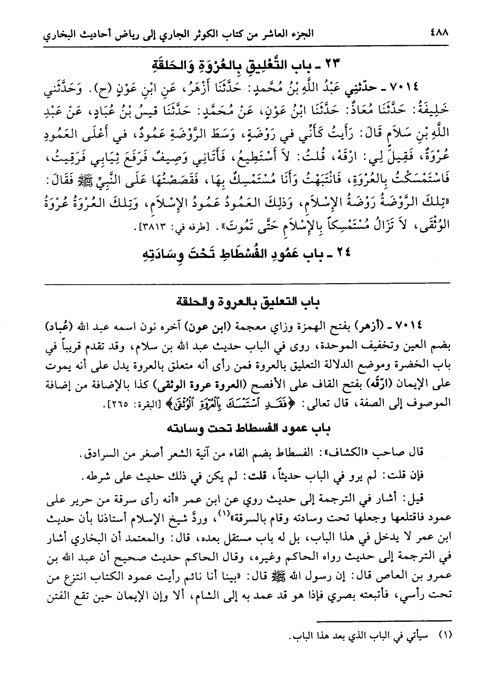 7014 - (أزهر) بفتح الهمزة وزاي معجمة (ابن عون) آخره نون اسمه عبد الله (عُباد) بضم العين وتخفيف الموحدة، روى في الباب حديث عبد الله بن سلام، وقد تقدم قريبًا في باب الخضرة وموضع الدلالة التعليق بالعروة فمن رأى أنه متعلق بالعروة يدل على أنه يموت على الإيمان (ارّقَه) بفتح القاف على الأفصح (العروة عروة الوثقى) كذا بالإضافة من إضافة الموصوف إلى الصفة، قال تعالى: {فَقَدِ اسْتَمْسَكَ بِالْعُرْوَةِ الْوُثْقَى} [البقرة: 256].