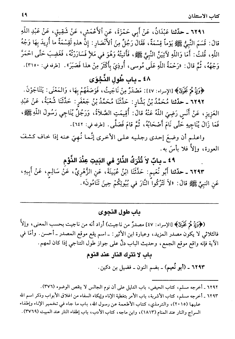 ({وَإِذْ هُمْ نَجْوَى} [الإسراء: 47] مصدرٌ من ناجيت) أراد أنه من ناجيت بحسب المعنى، وإلَّا فالثلاثي لا يكون مصدر المزيد، وعبارة ابن الأثير: -اسم يقع موقع المصدر- أحسن. وأمّا في الآية فإنه واقع موقع الجمع، وحديث الباب دلَّ على جواز طول التناجي إذا كان لمهم.