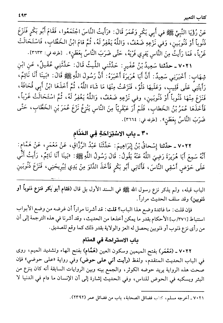 7022 - (مَعْمَر) بفتح الميمين وسكون العين (هَمَّام) بفتح الهاء وتشديد الميم، روى في الباب الحديث المتقدم، ولفظ (رأيت أني على حوض) وفي رواية "على حوضي" فإن صحت هذه الرواية يريد حوضه الكوثر، والجمع بينه وبين الروايات السابقة أنه كان ينزع من البئر ويسكبه في الحوض للناس، وفي الحديث إشارة إلى أن الإنسان ما دام في الدنيا لا