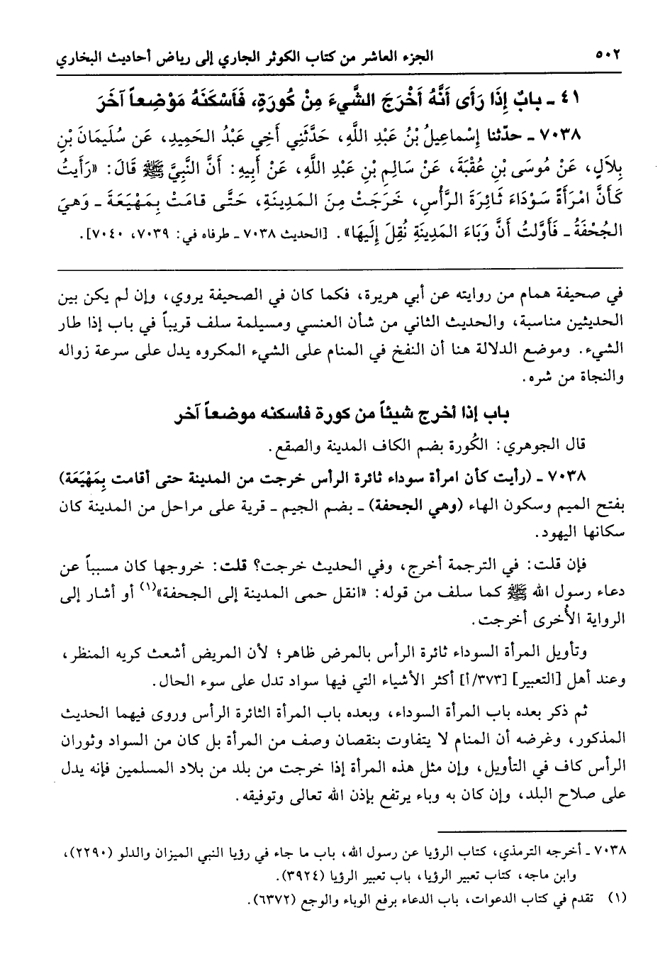 7038 - حَدَّثَنَا إِسْمَاعِيلُ بْنُ عَبْدِ اللَّهِ حَدَّثَنِى أَخِى عَبْدُ الْحَمِيدِ عَنْ سُلَيْمَانَ بْنِ بِلاَلٍ عَنْ مُوسَى بْنِ عُقْبَةَ عَنْ سَالِمِ بْنِ عَبْدِ اللَّهِ عَنْ أَبِيهِ أَنَّ النَّبِىَّ - صلى الله عليه وسلم - قَالَ «رَأَيْتُ كَأَنَّ امْرَأَةً سَوْدَاءَ ثَائِرَةَ الرَّأْسِ، خَرَجَتْ مِنَ الْمَدِينَةِ، حَتَّى قَامَتْ بِمَهْيَعَةَ - وَهْىَ الْجُحْفَةُ - فَأَوَّلْتُ أَنَّ وَبَاءَ الْمَدِينَةِ نُقِلَ إِلَيْهَا». طرفاه 7039، 7040