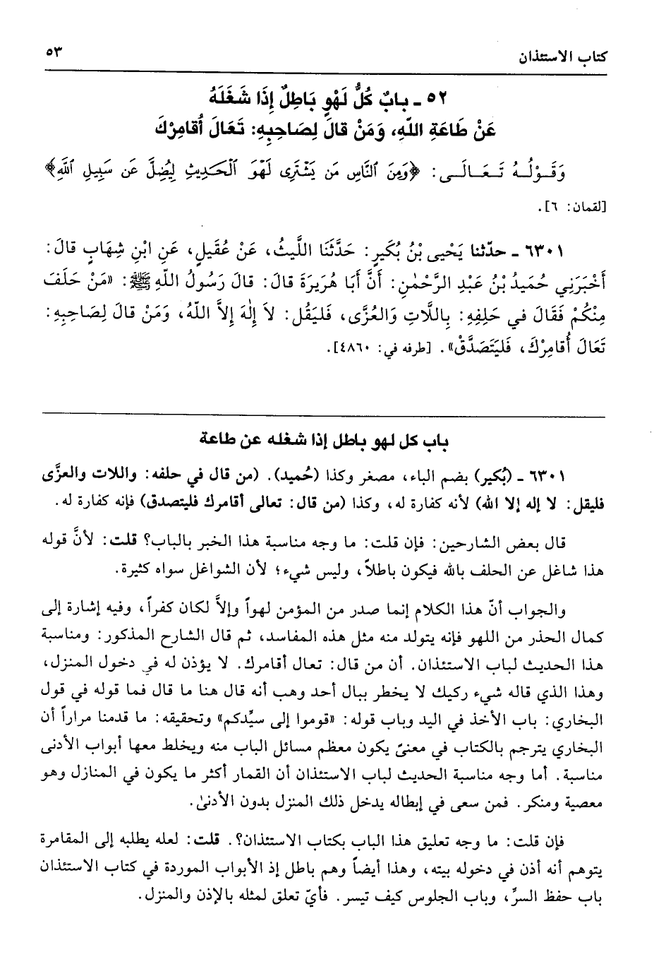 6301 - حَدَّثَنَا يَحْيَى بْنُ بُكَيْرٍ حَدَّثَنَا اللَّيْثُ عَنْ عُقَيْلٍ عَنِ ابْنِ شِهَابٍ قَالَ أَخْبَرَنِى حُمَيْدُ بْنُ عَبْدِ الرَّحْمَنِ أَنَّ أَبَا هُرَيْرَةَ قَالَ قَالَ رَسُولُ اللَّهِ - صلى الله عليه وسلم - «مَنْ حَلَفَ مِنْكُمْ فَقَالَ فِي حَلِفِهِ بِاللاَّتِ وَالْعُزَّى. فَلْيَقُلْ لاَ إِلَهَ إِلاَّ اللَّهُ. وَمَنْ قَالَ لِصَاحِبِهِ تَعَالَ أُقَامِرْكَ. فَلْيَتَصَدَّقْ». طرفه 4860