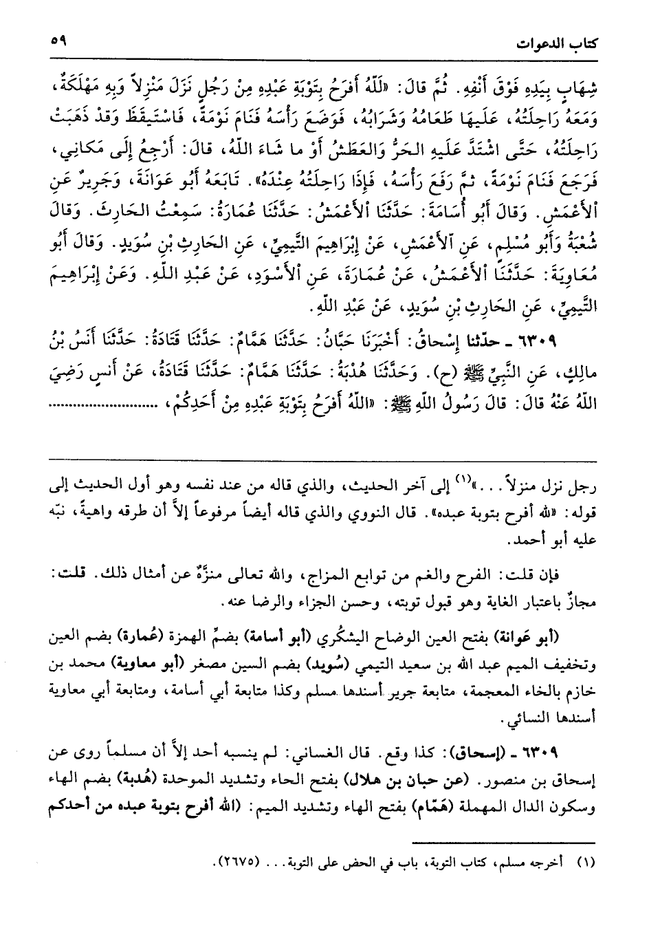 6309 - (إسحاق): كذا وقع. قال الغساني: لم ينسبه أحد إلَّا أن مسلمًا روى عن إسحاق بن منصور. (عن حبان بن هلال) بفتح الحاء وتشديد الموحدة (هُدبة) بضم الهاء وسكون الدال المهملة (هَمَّام) بفتح الهاء وتشديد الميم: (الله أفرح بتوبة عبده من أحدكم
