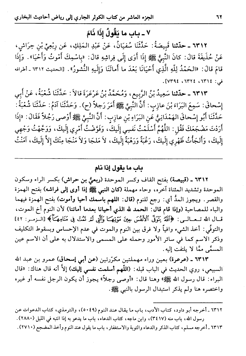 6312 - (قبيصة) بفتح القاف وكسر الموحدة (ربعيُّ بن حراش) بكسر الراء وسكون الموحدة وتشديد المثناة آخره، وحاء مهملة كان النبي - صلى الله عليه وسلم - إذا أوى إلى فراشه) بفتح الهمزة والقصر. ويجوز المدُّ أي: رجع للنوم (قال: اللهم باسمك أحيا وأموت) بفتح الهمزة فيهما والباء للمصاحبة (وإذا قام قال: الحمد لله الذي أحيانا بعدما أماتنا) لأن النوم أخ الموت، قال الله تعالى: {اللَّهُ يَتَوَفَّى الْأَنْفُسَ حِينَ مَوْتِهَا وَالَّتِي لَمْ تَمُتْ فِي مَنَامِهَا} [الزمر: 42] والتوفِّي: أخذ الشيء وافيًا ولا فرق بين النوم والموت في عدم الإحساس وبسقوط التكليف وذكر الاسم كما في سائر الأمور وحمله على المسمى والاستدلال به على أن الاسم عين المسمَّى ممَّا لا يلتفت إليه.
