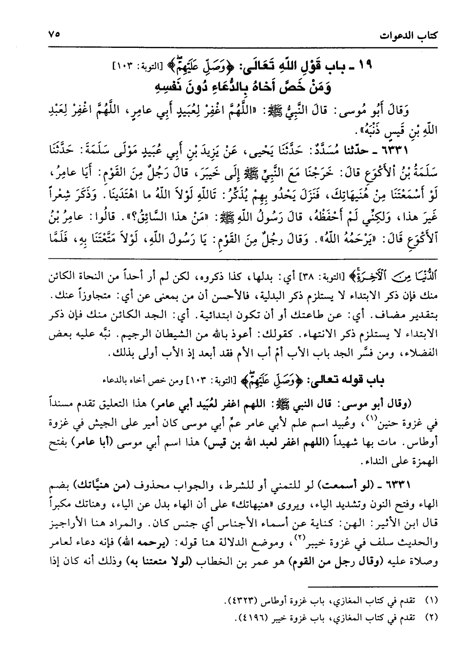 وَقَالَ أَبُو مُوسَى قَالَ النَّبِىُّ - صلى الله عليه وسلم - «اللَّهُمَّ اغْفِرْ لِعُبَيْدٍ أَبِى عَامِرٍ، اللَّهُمَّ اغْفِرْ لِعَبْدِ اللَّهِ بْنِ قَيْسٍ ذَنْبَهُ».