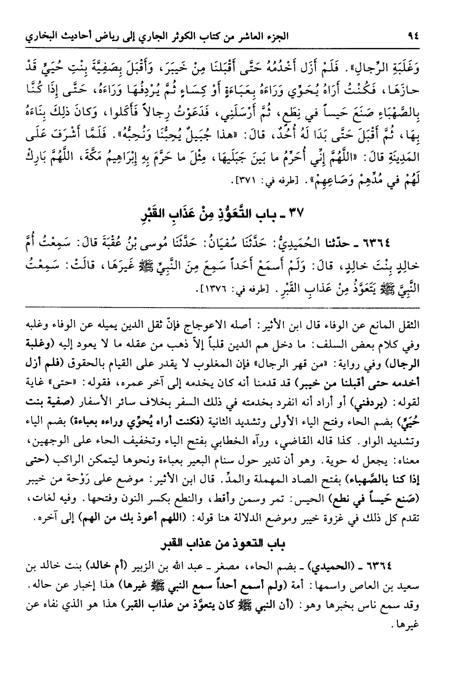6364 - (الحميدي) -بضم الحاء، مصغر- عبد الله بن الزبير (أم خالد) بنت خالد بن سعيد بن العاص واسمها: أمة (ولم أسمع أحدًا سمع النبي - صلى الله عليه وسلم - غيرها) هذا إخبار عن حاله. وقد سمع ناس بخبرها وهو: (أن النبي - صلى الله عليه وسلم - كان يتعوَّذ من عذاب القبر) هذا هو الذي نفاه عن