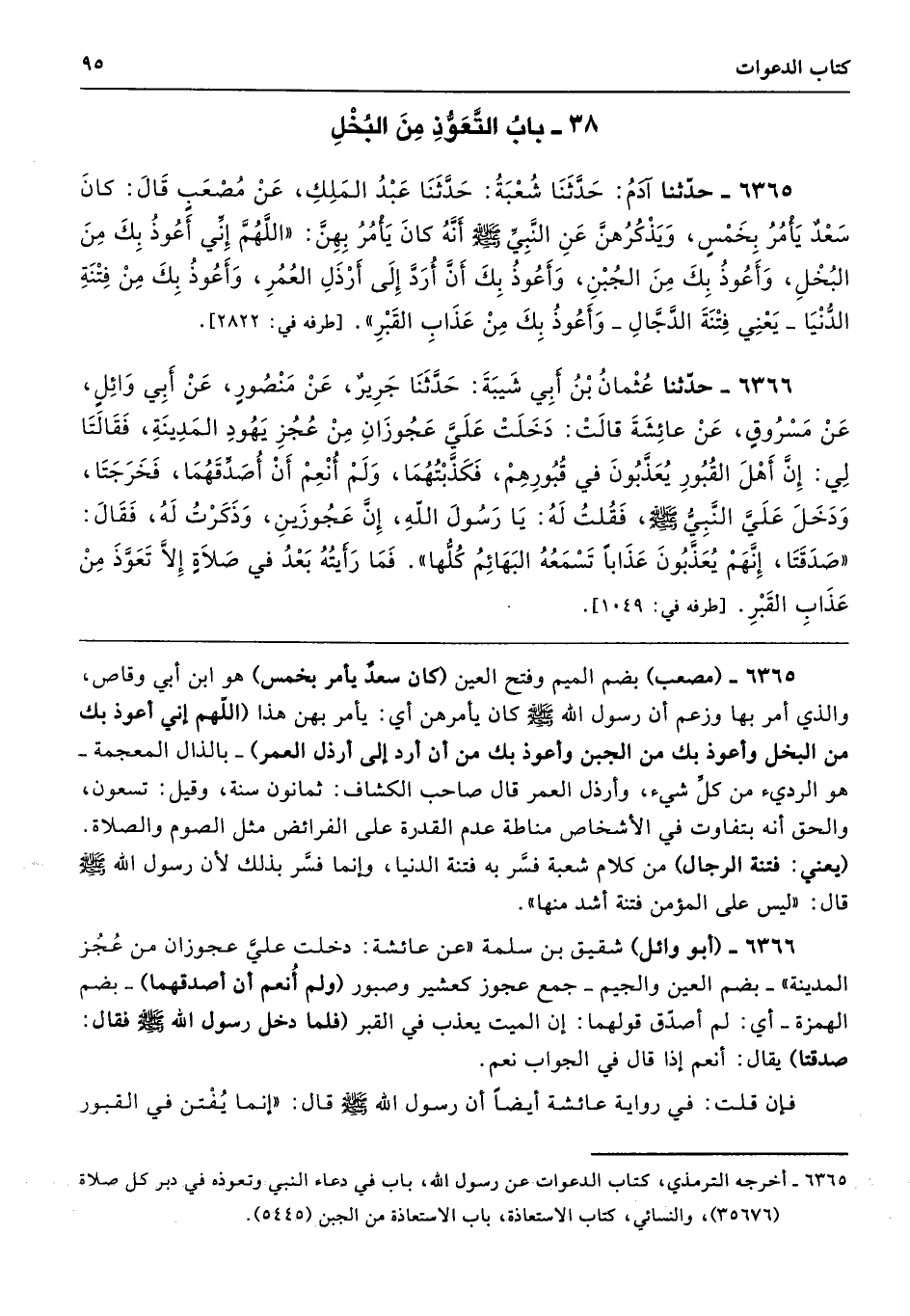 6365 - (مصعب) بضم الميم وفتح العين (كان سعدٌ يأمر بخمس) هو ابن أبي وقاص، والذي أمر بها وزعم أن رسول الله - صلى الله عليه وسلم - كان يأمرهن أي: يأمر بهن هذا (اللَّهم إني أعوذ بك من البخل وأعوذ بك من الجبن وأعوذ بك من أن أرد إلى أرذل العمر) -بالذال المعجمة- هو الرديء من كلِّ شيء، وأرذل العمر قال صاحب الكشاف: ثمانون سنة، وقيل: تسعون، والحق أنه بتفاوت في الأشخاص مناطة عدم القدرة على الفرائض مثل الصوم والصلاة. (يعني: فتنة الرجال) من كلام شعبة فسَّر به فتنة الدنيا، وإنما فسَّر بذلك لأن رسول الله - صلى الله عليه وسلم - قال: "ليس على المؤمن فتنة أشد منها".