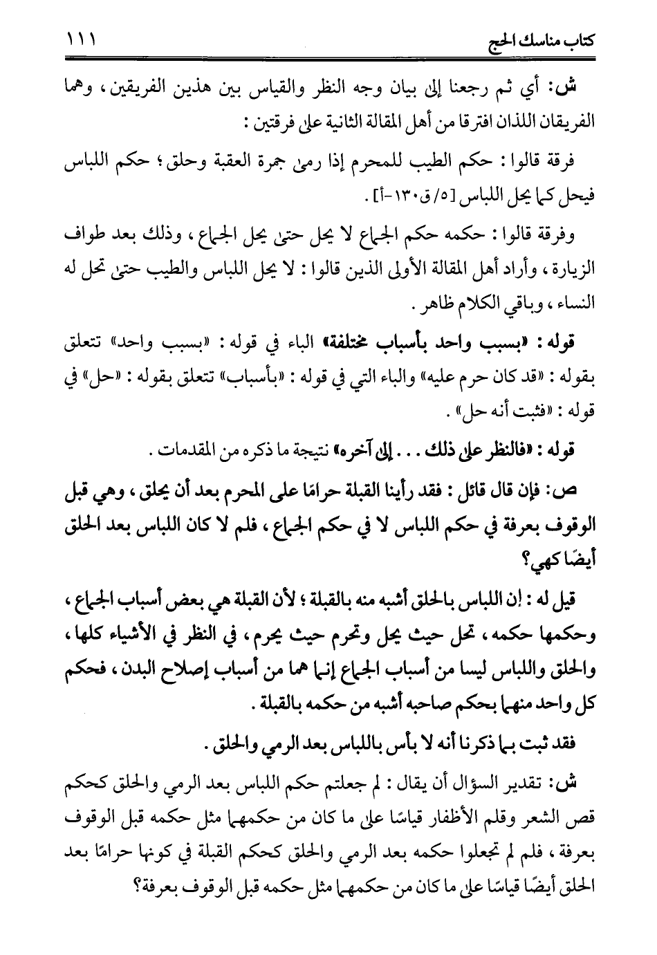 ش: تقدير السؤال أن يقال: لم جعلتم حكم اللباس بعد الرمي والحلق كحكم قص الشعر وقلم الأظفار قياسًا على ما كان من حكمهما مثل حكمه قبل الوقوف بعرفة، فلم لم تجعلوا حكمه بعد الرمي والحلق كحكم القبلة في كونها حرامًا بعد الحلق أيضًا قياسًا على ما كان من حكمهما مثل حكمه قبل الوقوف بعرفة؟