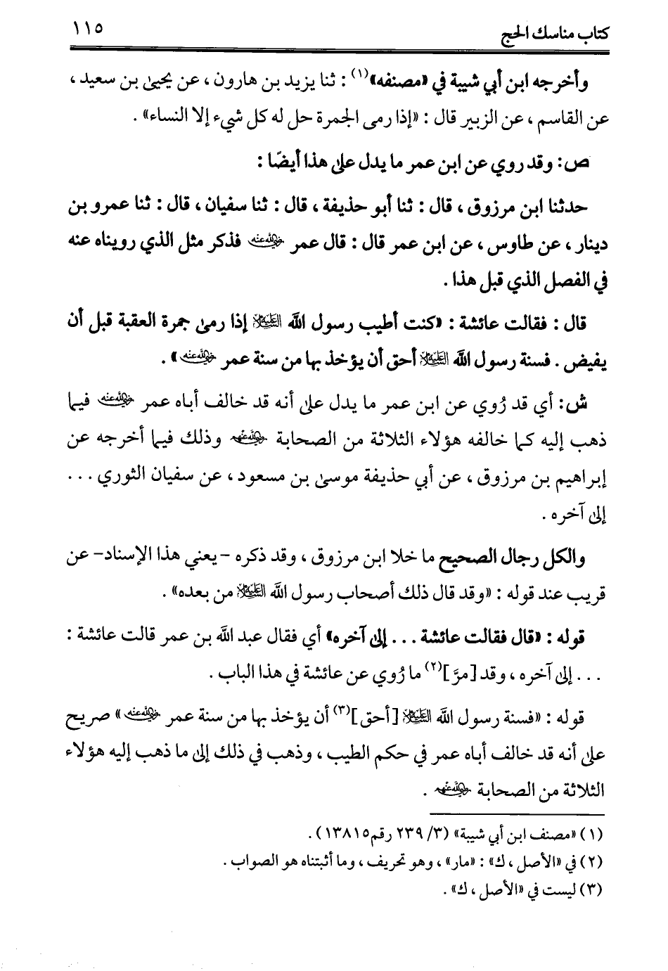 قال: فقالت عائشة: "كنت أطيب رسول الله -عليه السلام- إذا رمى جمرة العقبة قبل أن يفيض. فسنة رسول الله -عليه السلام- أحق أن يؤخد بها من سنة عمر -رضي الله عنه-".