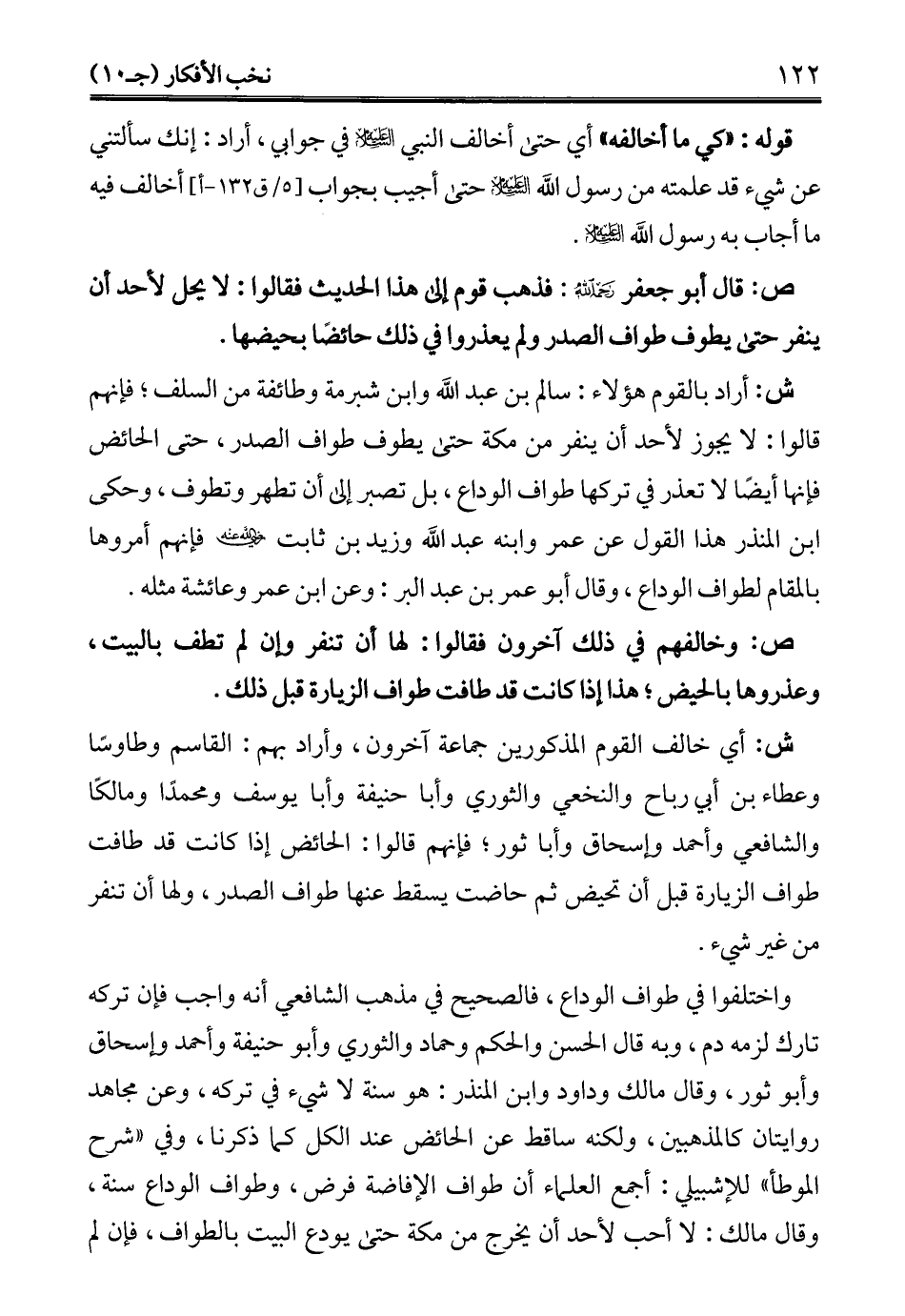 ش: أراد بالقوم هؤلاء: سالم بن عبد الله وابن شبرمة وطائفة من السلف؛ فإنهم قالوا: لا يجوز لأحد أن ينفر من مكة حتى يطوف طواف الصدر، حتى الحائض فإنها أيضًا لا تعذر في تركها طواف الوداع، بل تصبر إلى أن تطهير وتطوف، وحكى ابن المنذر هذا القول عن عمر وابنه عبد الله وزيد بن ثابت -رضي الله عنه- فإنهم أمروها بالمقام لطواف الوداع، وقال أبو عمر بن عبد البر: وعن ابن عمر وعائشة مثله.