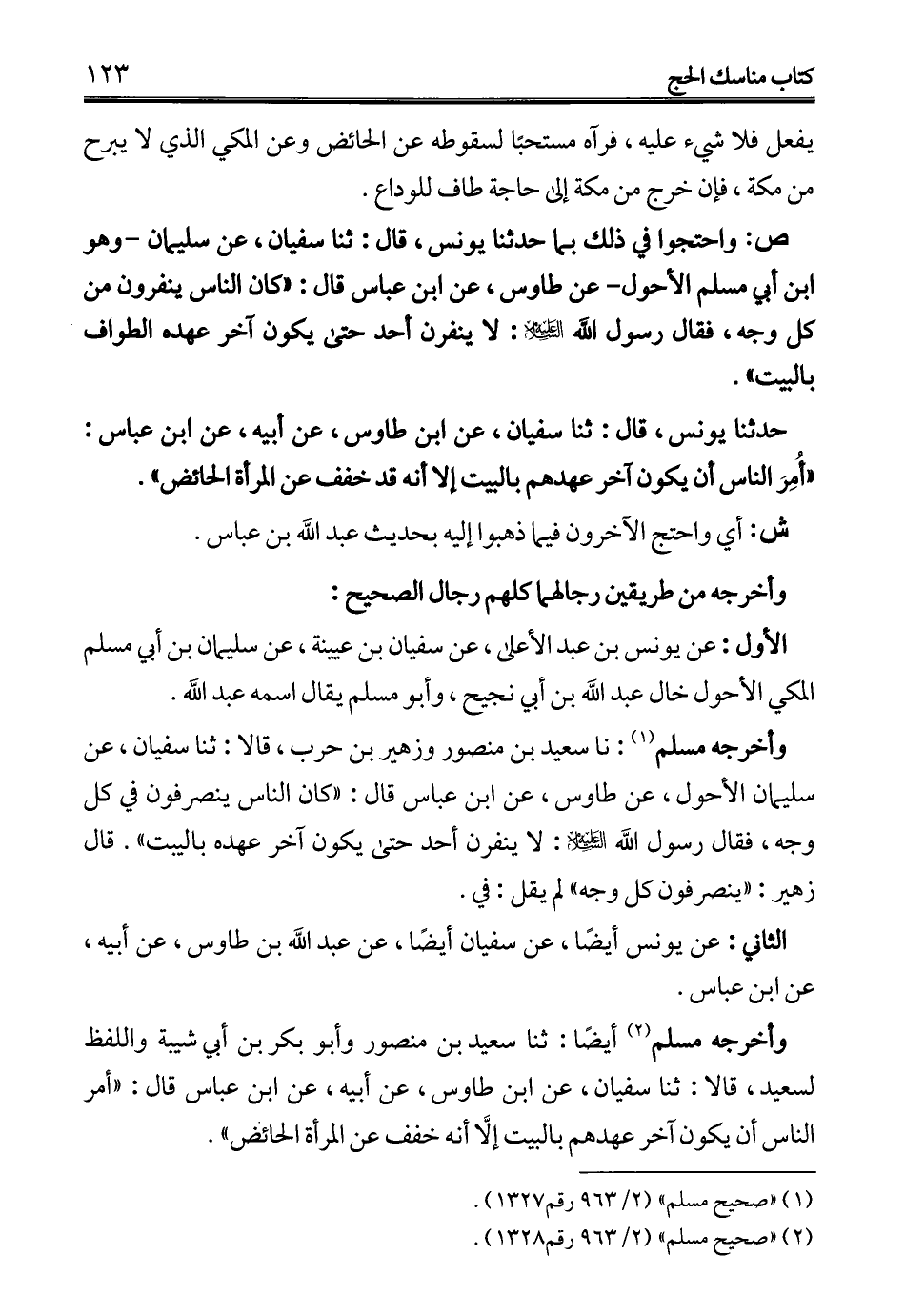 وأخرجه مسلم (¬2) أيضاً: ثنا سعيد بن منصور وأبو بكر بن أبي شيبة واللفظ لسعيد، قالا: ثنا سفيان، عن ابن طاوس، عن أبيه، عن ابن عباس قال: "أمر الناس أن يكون آخر عهدهم بالبيت إلاَّ أنه خفف عن المرأة الحائض".