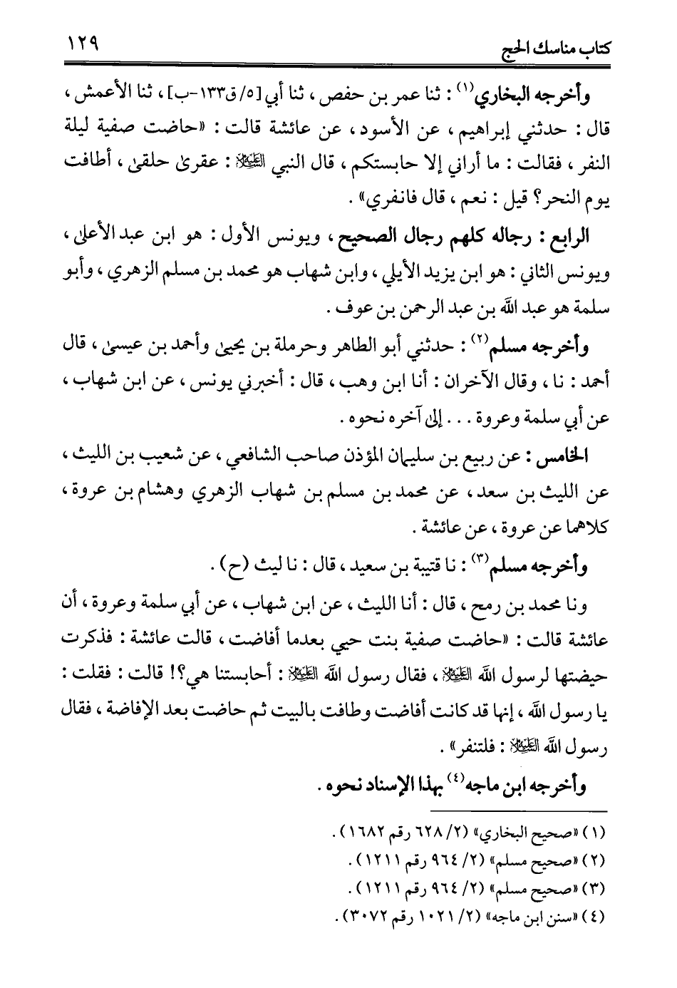 ونا محمد بن رمح، قال: أنا الليث، عن ابن شهاب، عن أبي سلمة وعروة، أن عائشة قالت: "حاضت صفية بنت حيي بعدما أفاضت، قالت عائشة: فذكرت حيضتها لرسول الله -عليه السلام-، فقال رسول الله -عليه السلام-: أحابستنا هي؟! قالت: فقلت: يا رسول الله، إنها قد كانت أفاضت وطافت بالبيت ثم حاضت بعد الإِفاضة، فقال رسول الله -عليه السلام-: فلتنفر".