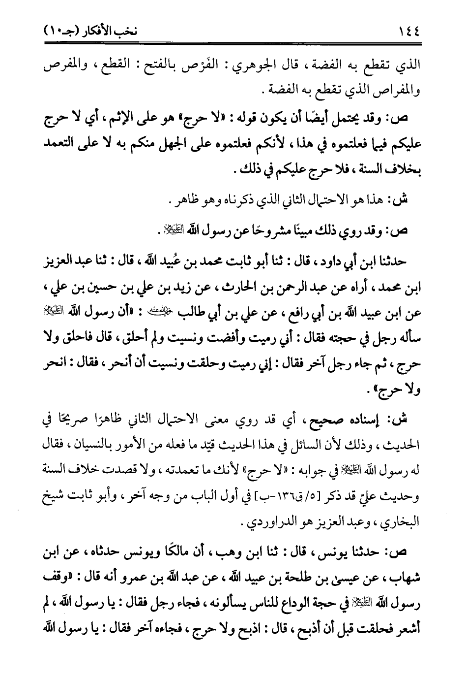ش: إسناده صحيح، أي قد روي معنى الاحتمال الثاني ظاهرًا صريحًا في الحديث، وذلك لأن السائل في هذا الحديث قيّد ما فعله من الأمور بالنسيان، فقال له رسول الله -عليه السلام- في جوابه: "لا حرج" لأنك ما تعمدته، ولا قصدت خلاف السنة وحديث عليّ قد ذكر في أول الباب من وجه آخر، وأبو ثابت شيخ البخاري، وعبد العزيز هو الدراوردي.
