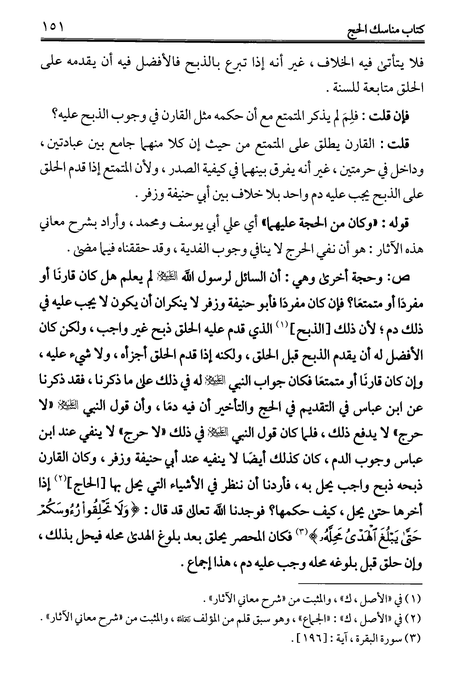 ص: وحجة أخرى وهي: أن السائل لرسول الله -عليه السلام- لم يعلم هل كان قارنًا أو مفردًا أو متمتعًا؟ فإن كان مفردًا فأبو حنيفة وزفر لا ينكران أن يكون لا يجب عليه في ذلك دم؛ لأن ذلك [الذبح] (¬1) الذي قدم عليه الحلق ذبح غير واجب، ولكن كان الأفضل له أن يقدم الذبح قبل الحلق، ولكنه إذا قدم الحلق أجزأه، ولا شيء عليه، وإن كان قارنًا أو متمتعًا فكان جواب النبي -عليه السلام- له في ذلك على ما ذكرنا، فقد ذكرنا عن ابن عباس في التقديم في الحج والتأخير أن فيه دمًا، وأن قول النبي -عليه السلام- "لا حرج" لا يدفع ذلك، فلما كان قول النبي -عليه السلام- في ذلك "لا حرج" لا ينفي عند ابن عباس وجوب الدم، كان كذلك أيضًا لا ينفيه عند أبي حنيفة وزفر، وكان القارن ذبحه ذبح واجب يحل به، فأردنا أن ننظر في الأشياء التي يحل بها [الحاج] (¬2) إذا أخرها حتى يحل، كيف حكمها؟ فوجدنا الله تعالى قد قال: {وَلَا تَحْلِقُوا رُءُوسَكُمْ حَتَّى يَبْلُغَ الْهَدْيُ مَحِلَّهُ} (¬3) فكان المحصر يحلق بعد بلوغ الهدى محله فيحل بذلك، وإن حلق قبل بلوغه محله وجب عليه دم، هذا إجماع.