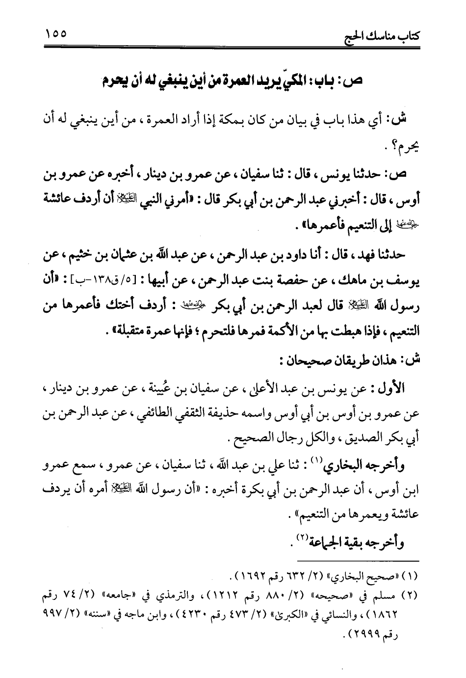 ص: حدثنا يونس، قال: ثنا سفيان، عن عمرو بن دينار، أخبره عن عمرو بن أوس، قال: أخبرني عبد الرحمن بن أبي بكر قال: "أمرني النبي -عليه السلام- أن أردف عائشة -رضي الله عنها- إلى التنعيم فأعمرها".