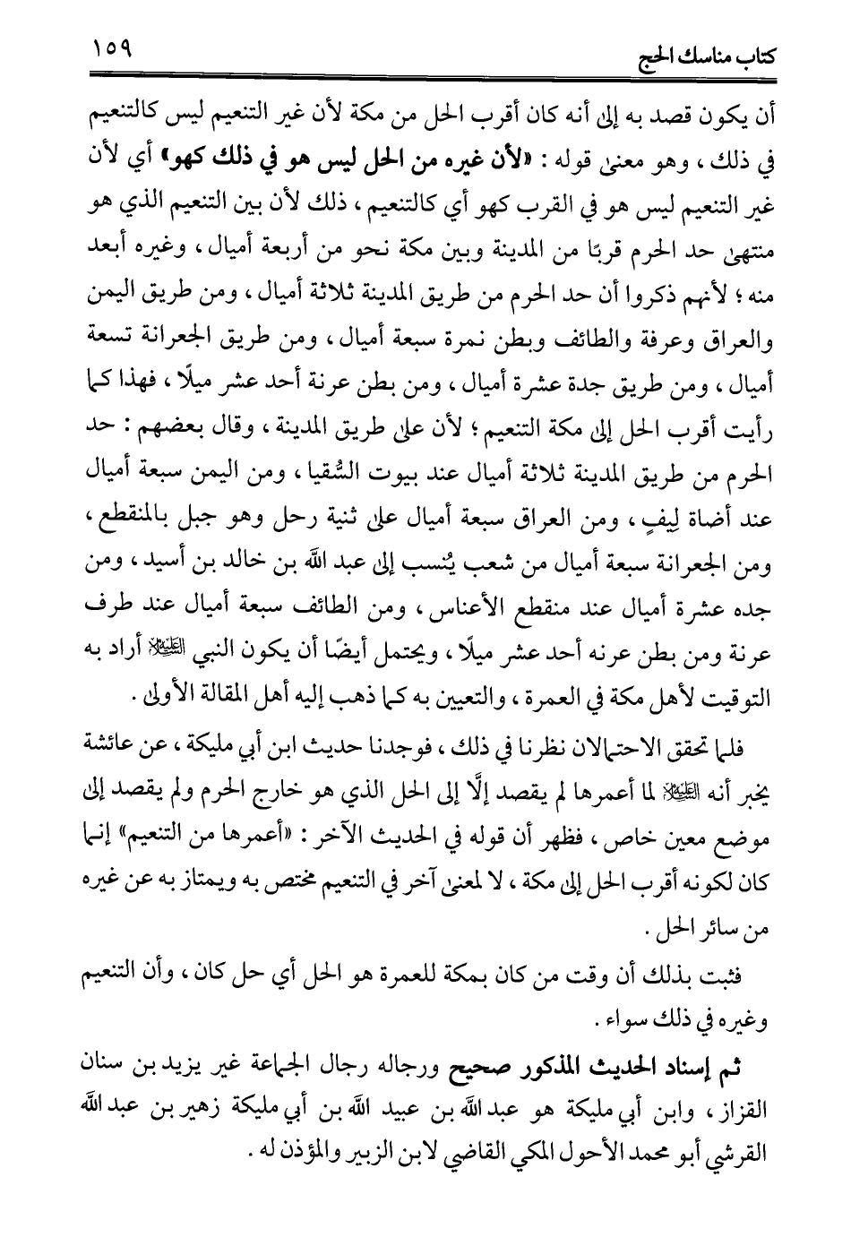 فلما تحقق الاحتمالان نظرنا في ذلك، فوجدنا حديث ابن أبي مليكة، عن عائشة يخبر أنه -عليه السلام- لما أعمرها لم يقصد إلاَّ إلى الحل الذي هو خارج الحرم ولم يقصد إلى موضع معين خاص، فظهر أن قوله في الحديث الآخر: "أعمرها من التنعيم" إنما كان لكونه أقرب الحل إلى مكة، لا لمعنى آخر في التنعيم مختص به ويمتاز به عن غيره من سائر الحل.