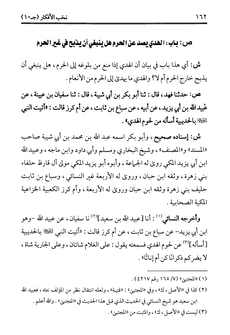 ص: حدثنا فهد، قال: ثنا أبو بكر بن أبي شيبة، قال: ثنا سفيان بن عيينة، عن عُبيد الله بن أبي يزيد، عن أبيه، عن سباع بن ثابت، عن أم كرز قالت: "أتيت النبي -عليه السلام- بالحديبية أسأله من لحوم الهدي".