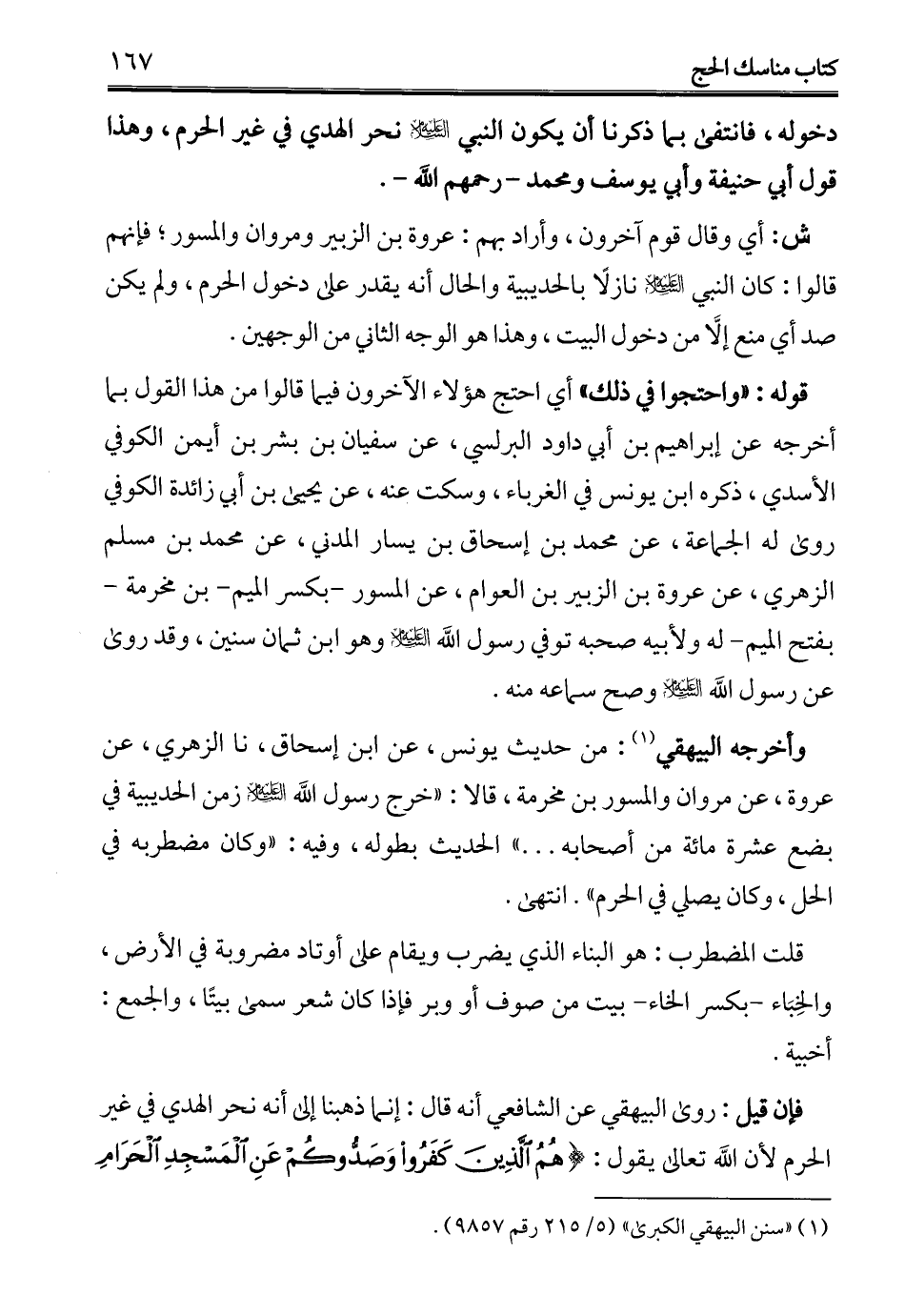 وأخرجه البيهقي (¬1): من حديث يونس، عن ابن إسحاق، نا الزهري، عن عروة، عن مروان والمسور بن مخرمة، قالا: "خرج رسول الله -عليه السلام- زمن الحديبية في بضع عشرة مائة من أصحابه ... " الحديث بطوله، وفيه: "وكان مضطربه في الحل، وكان يصلي في الحرم". انتهى.
