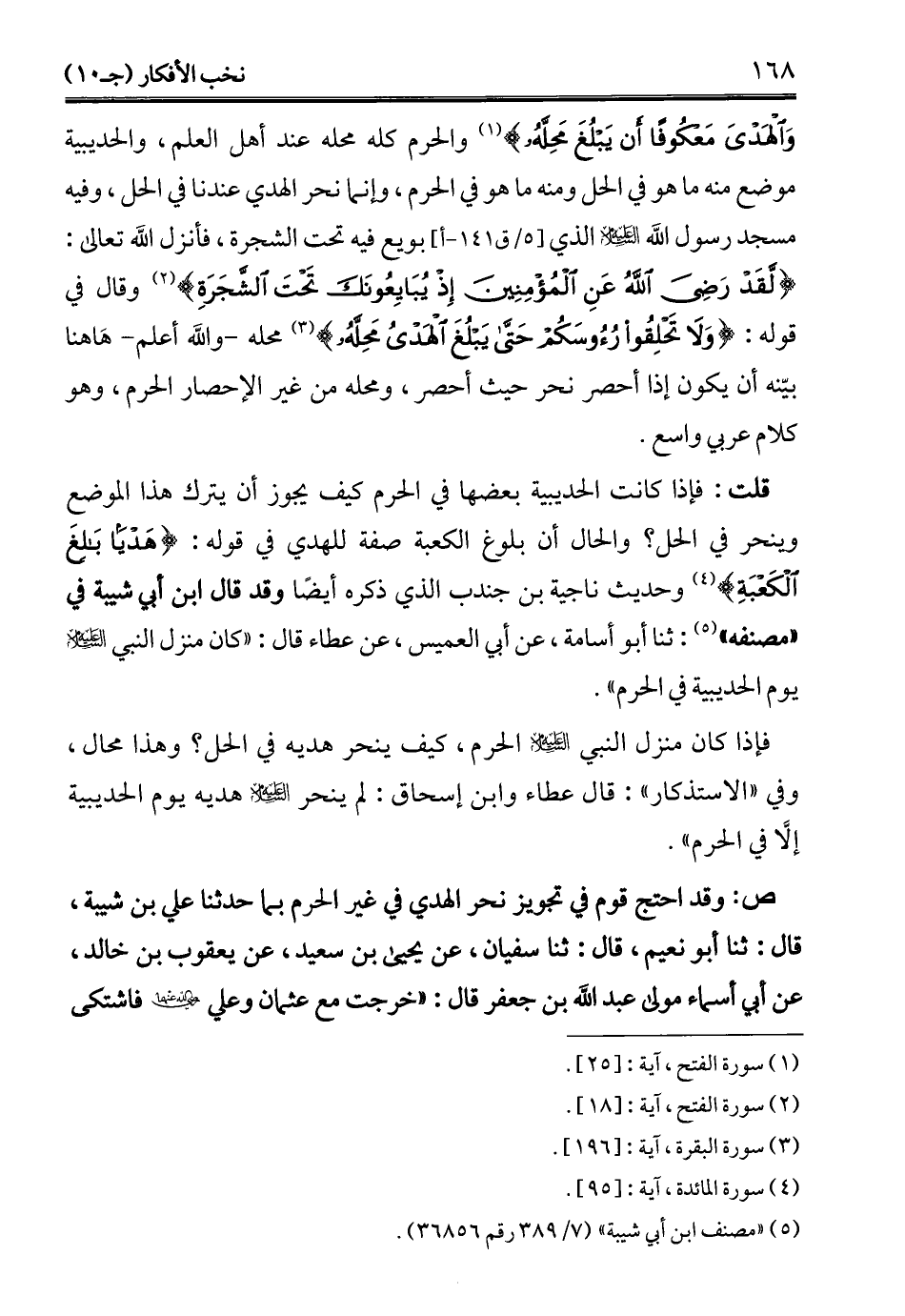 قلت: فإذا كانت الحديبية بعضها في الحرم كيف يجوز أن يترك هذا الموضع وينحر في الحل؟ والحال أن بلوغ الكعبة صفة للهدي في قوله: {هَدْيًا بَالِغَ الْكَعْبَةِ} (¬4) وحديث ناجية بن جندب الذي ذكره أيضًا وقد قال ابن أبي شيبة في "مصنفه" (¬5): ثنا أبو أسامة، عن أبي العميس، عن عطاء قال: "كان منزل النبي -عليه السلام- يوم الحديبية في الحرم".