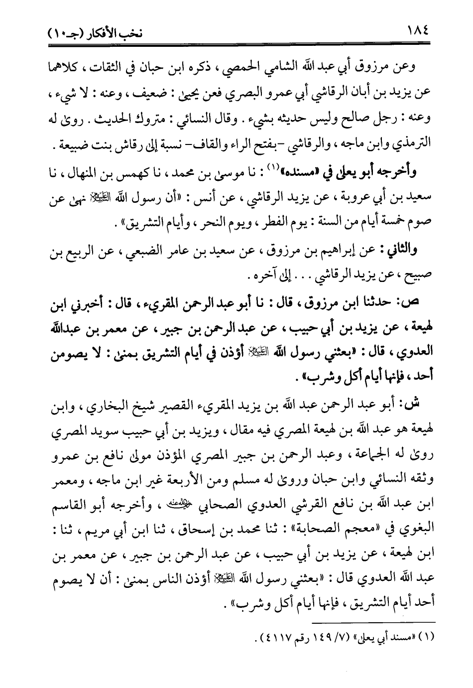 ص: حدثنا ابن مرزوق، قال: نا أبو عبد الرحمن المقريء، قال: أخبرني ابن لهيعة، عن يزيد بن أبي حبيب، عن عبد الرحمن بن جبير، عن معمر بن عبد الله العدوي، قال: "بعثني رسول الله -عليه السلام- أؤذن في أيام التشريق بمنى: لا يصومن أحد، فإنها أيام أكل وشرب".