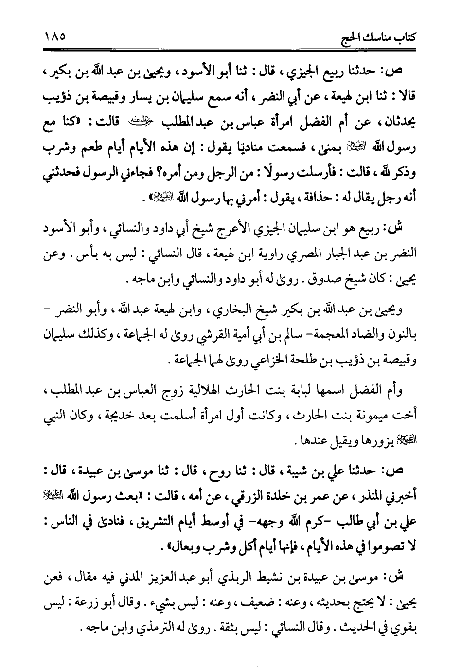 ش: ربيع هو ابن سليمان الجيزي الأعرج شيخ أبي داود والنسائي، وأبو الأسود النضر بن عبد الجبار المصري راوية ابن لهيعة، قال النسائي: ليس به بأس. وعن يحيى: كان شيخ صدوق. روى له أبو داود والنسائي وابن ماجه.