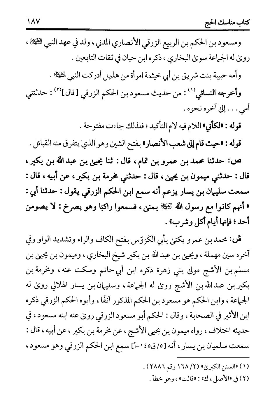 ش: محمد بن عمرو يكنى بأبي الكَرَوّس بفتح الكاف والراء وتشديد الواو وفي آخره سين مهملة، ويحيى بن عبد الله بن بكير شيخ البخاري، وميمون بن يحيى بن مسلم بن الأشج مولى بني زهرة ذكره ابن أبي حاتم وسكت عنه، ومخرمة بن بكير بن عبد الله بن الأشج روى له الجماعة، وسليمان بن يسار الهلالي روى له الجماعة، وابن الحكم هو مسعود بن الحكم المذكور آنفًا، وأبوه الحكم الزرقي ذكره ابن الأثير في الصحابة، وقال: الحكم أبو مسعود الزرقي روى عنه ابنه مسعود، في حديثه اختلاف، رواه ميمون بن يحيى الأشج، عن مخرمة بن بكير، عن أبيه، قال: سمعت سلميان بن يسار، أنه سمع ابن الحكم الزرقي وهو مسعود،