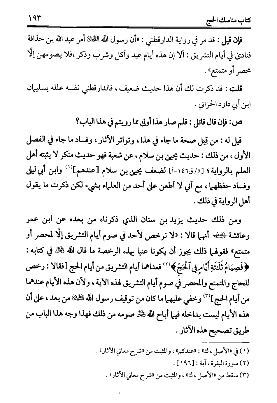 ومن ذلك حديث يزيد بن سنان الذي ذكرناه من بعده عن ابن عمر وعائشة -رضي الله عنهم- أنهما قالا: "لا نرخص لأحد في صوم أيام التشريق إلاَّ لمحصر أو متمتع" فقولهما ذلك يجوز أن يكونا عنيا بهذه الرخصة ما قال الله -عز وجل- في كتابه: {فَصِيَامُ ثَلَاثَةِ أَيَّامٍ فِي الْحَجِّ} (¬2) فعداهما أيام التشريق من أيام الحج [فقالا: رخص للحاج والمتمتع والمحصر في صوم أيام التشريق لهذه الآية، ولأن هذه الأيام عندهما من أيام الحج] (¬3) وخفي عليهما ما كان من توقيف رسول الله -عليه السلام- من بعد، على أن هذه الأيام ليست بداخله فيما أباح الله -عز وجل- صومه من ذلك فهذا وجه هذا الباب من طريق تصحيح هذه الآثار.