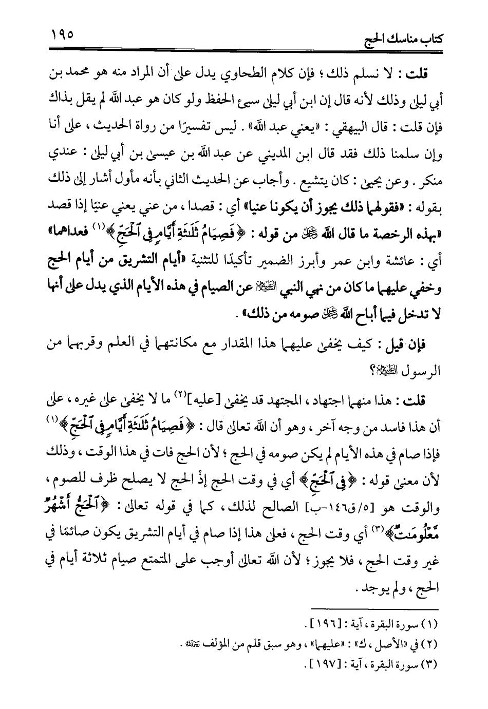قلت: هذا منهما اجتهاد، المجتهد قد يخفى [عليه] (¬2) ما لا يخفى على غيره، على أن هذا فاسد من وجه آخر، وهو أن الله تعالى قال: {فَصِيَامُ ثَلَاثَةِ أَيَّامٍ فِي الْحَجِّ} (1) فإذا صام في هذه الأيام لم يكن صومه في الحج؛ لأن الحج فات في هذا الوقت، وذلك لأن معنى قوله: {فِي الْحَجِّ} أي في وقت الحج إذْ الحج لا يصلح ظرف للصوم، والوقت هو الصالح لذلك، كما في قوله تعالى: {الْحَجُّ أَشْهُرٌ مَعْلُومَاتٌ} (¬3) أي وقت الحج، فعلى هذا إذا صام في أيام التشريق يكون صائمًا في غير وقت الحج، فلا يجوز؛ لأن الله تعالى أوجب على المتمتع صيام ثلاثة أيام في الحج، ولم يوجد.