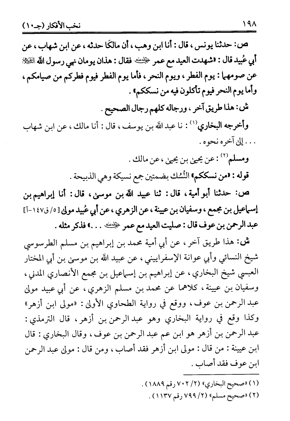 ص: حدثنا يونس، قال: أنا ابن وهب، أن مالكًا حدثه، عن ابن شهاب، عن أبي عُبيد قال: "شهدت العيد مع عمر -رضي الله عنه- فقال: هذان يومان نهي رسول الله -عليه السلام- عن صومهما: يوم الفطر، ويوم النحر، فأما يوم الفطر فيوم فطركم من صيامكم، وأما يوم النحر فيوم تأكون فيه من نسككم".