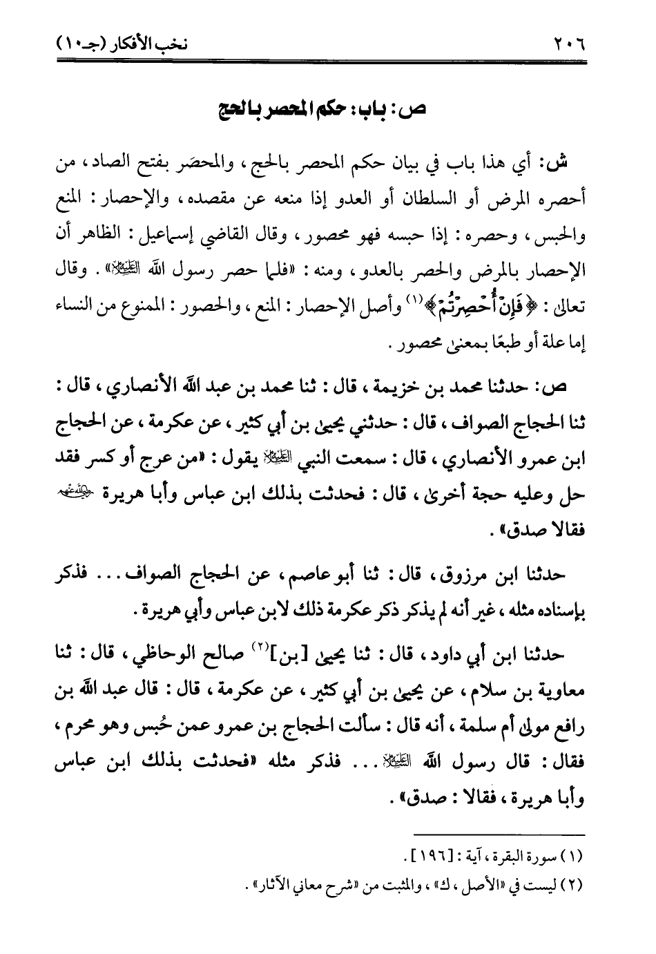 ص: حدثنا محمد بن خزيمة، قال: ثنا محمد بن عبد الله الأنصاري، قال: ثنا الحجاج الصواف، قال: حدثني يحيى بن أبي كثير، عن عكرمة، عن الحجاج ابن عمرو الأنصاري، قال: سمعت النبي -عليه السلام- يقول: "من عرج أو كسر فقد حل وعليه حجة أخرى، قال: فحدثت بذلك ابن عباس وأبا هريرة -رضي الله عنهم- فقالا صدق".