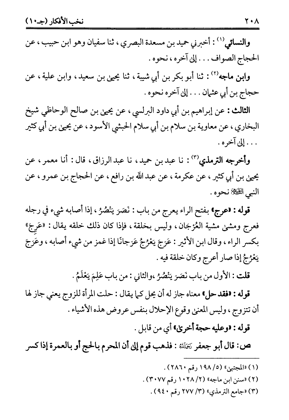 والنسائي (¬1): أخبرني حميد بن مسعدة البصري، ثنا سفيان وهو ابن حبيب، عن الحجاج الصواف ... إلى آخره، نحوه.