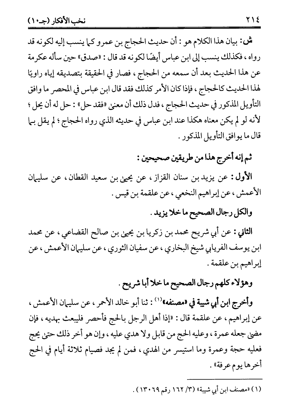 ش: بيان هذا الكلام هو: أن حديث الحجاج بن عمرو كما ينسب إليه لكونه قد رواه، فكذلك ينسب إلى ابن عباس أيضًا لكونه قد قال: "صدق" حين سأله عكرمة عن هذا الحديث بعد أن سمعه من الحجاج، فصار في الحقيقة بتصديقه إياه راويًا لهذا الحديث كالحجاج، فإذا كان الأمر كذلك فقد قال ابن عباس في المحصر ما وافق التأويل المذكور في حديث الحجاج، فدل ذلك أن معنى "فقد حل": حل له أن يحل؛ لأنه لو لم يكن معناه هكذا عند ابن عباس في حديثه الذي رواه الحجاج؛ لم يقل بما قال ما يوافق التأويل المذكور.