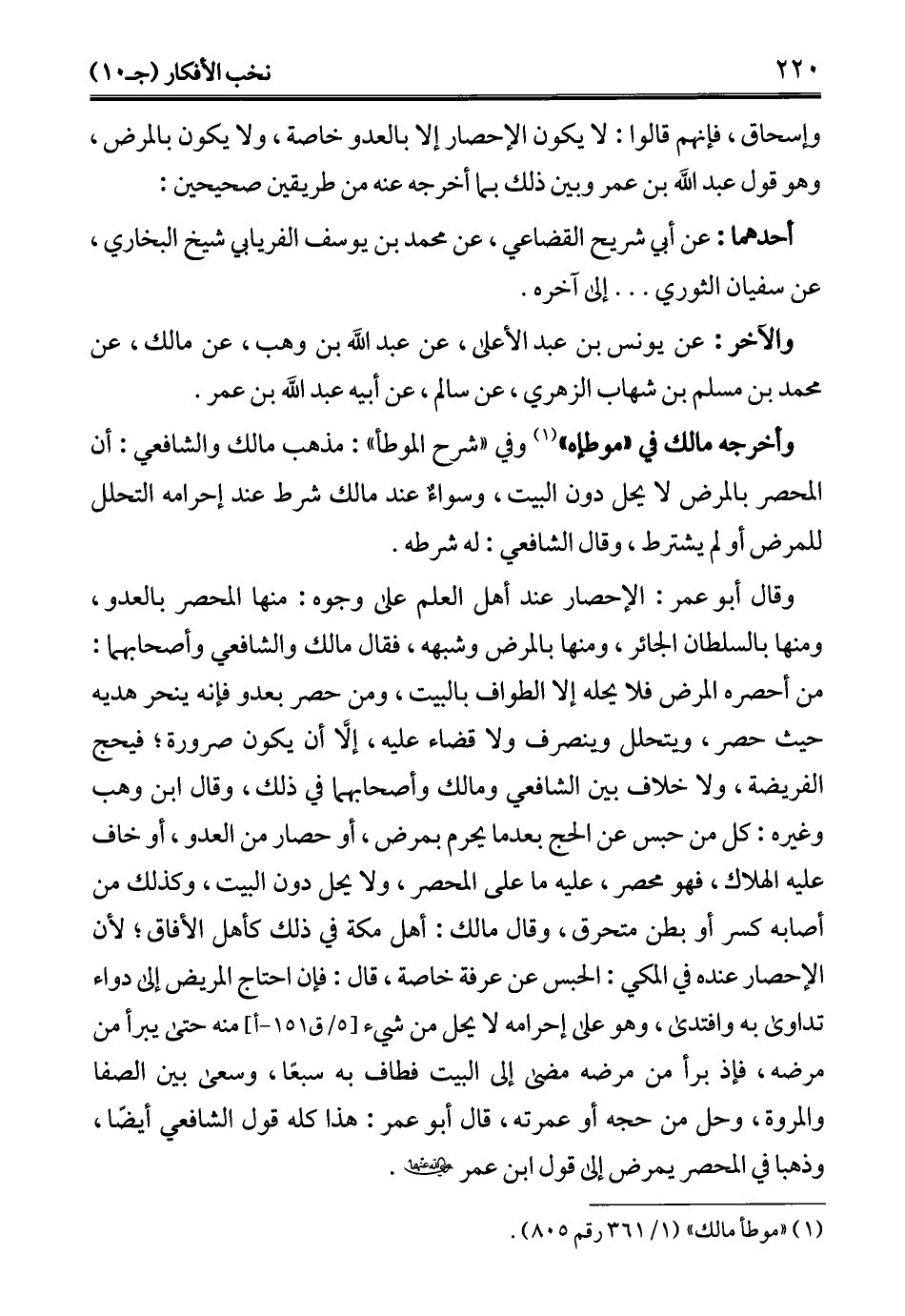 وإسحاق، فإنهم قالوا: لا يكون الإِحصار إلا بالعدو خاصة، ولا يكون بالمرض، وهو قول عبد الله بن عمر وبين ذلك بما أخرجه عنه من طريقين صحيحين: