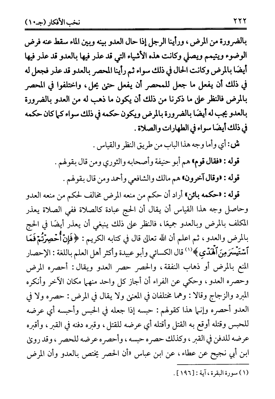 بالضرورة من المرض، ورأينا الرجل إذا حال العدو بينه وبين الماء سقط عنه فرض الوضوء ويتيمم ويصلي وكانت هذه الأشياء التي قد عذر فيها بالعدو قد عذر فيها أيضًا بالمرض وكانت الحال في ذلك سواء ثم رأينا المحصر بالعدو قد عذر فجعل له في ذلك أن يفعل ما جعل للمحصر أن يفعل حتى يحل، واختلفوا في المحصر بالمرض فالنظر على ما ذكرنا من ذلك أن يكون ما ذهب له من العدو بالضرورة بالعدو يجب له أيضًا بالضرورة بالمرض ويكون حكمه في ذلك سواء كما كان حكمه في ذلك أيضًا سواء في الطهارات والصلاة.