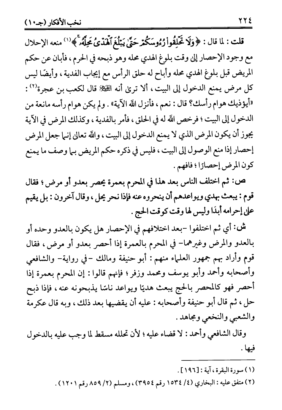 قلت: لما قال: {الْهَدْيِ وَلَا تَحْلِقُوا رُءُوسَكُمْ حَتَّى يَبْلُغَ الْهَدْيُ مَحِلَّهُ} (¬1) منعه الإِحلال مع وجود الإِحصار إلى وقت بلوغ الهدي محله وهو ذبحه في الحرم، فأبان عن حكم المريض قبل بلوغ الهدي محله وأباح له حلق الرأس مع إيجاب الفدية، وأيضًا ليس كل مرض يمنع الدخول إلى البيت، ألا ترى أنه -عليه السلام- قال لكعب بن عجرة (¬2): "أيؤذيك هوام رأسك؟ قال: نعم، فأنزل الله الآية". ولم يكن هوام رأسه مانعة من الدخول إلى البيت؛ فرخص الله له في الحلق، فأمر بالفدية، وكذلك المرض في الآية يجوز أن يكون المرض الذي لا يمنع الدخول إلى البيت، والله تعالى إنما جعل المرض إحصار إذا منع الوصول إلى البيت، فليس في ذكره حكم المريض بما وصف ما يمنع كون المرض إحصارًا؛ فافهم.