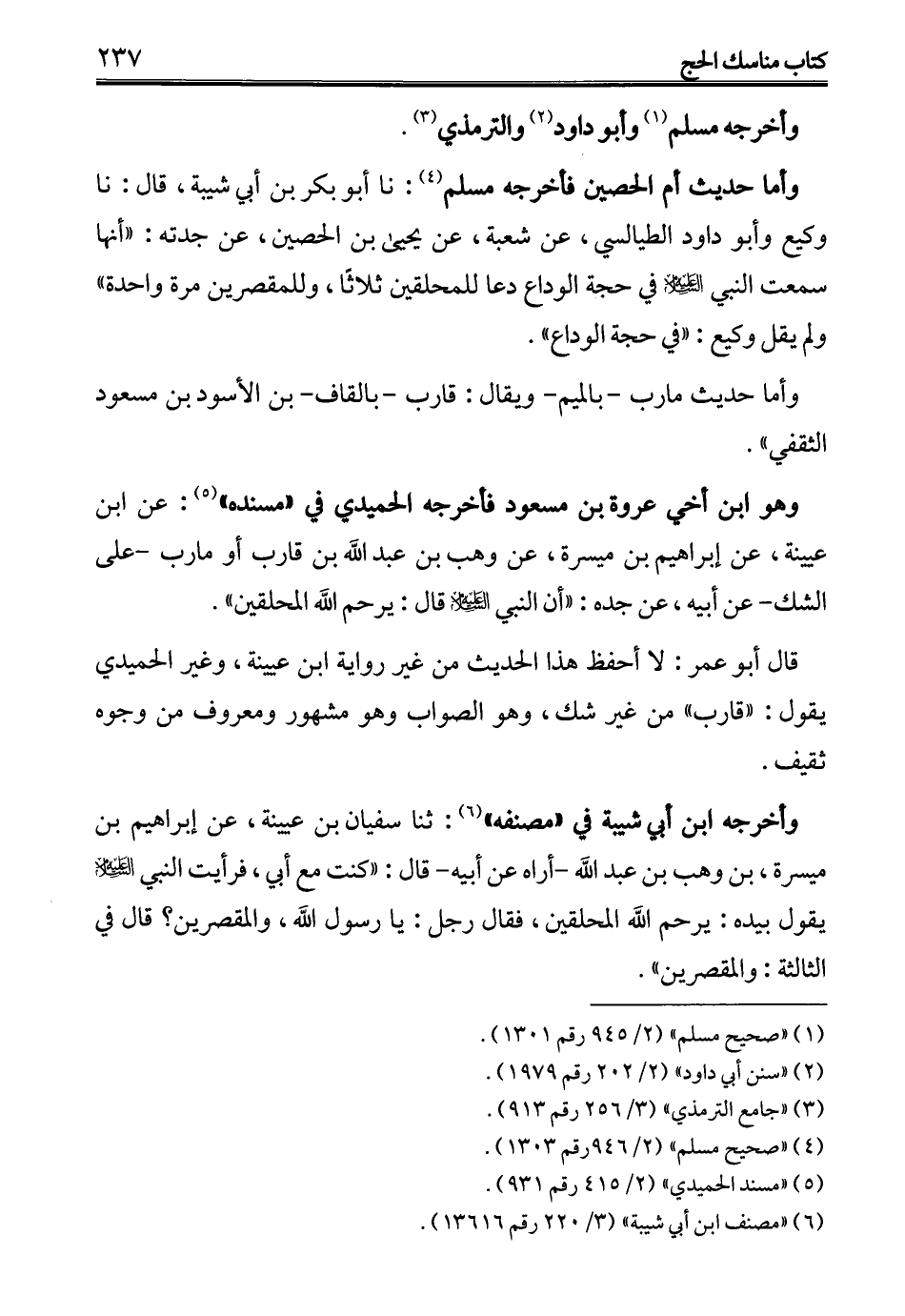 وأما حديث أم الحصين فأخرجه مسلم (¬4): نا أبو بكر بن أبي شيبة، قال: نا وكيع وأبو داود الطيالسي، عن شعبة، عن يحيى بن الحصين، عن جدته: "أنها سمعت النبي -عليه السلام- في حجة الوداع دعا للمحلقين ثلاثًا, وللمقصرين مرة واحدة" ولم يقل وكيع: "في حجة الوداع".