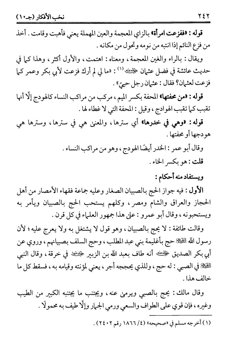الأول: فيه جواز الحج بالصبيان الصغار وعليه جماعة فقهاء الأمصار من أهل الحجاز والعراق والشام ومصر، وكلهم يستحب الحج بالصبيان ويأمر به ويستحبونه، وقال أبو عمرو: على هذا جمهور العلماء في كل قرن.