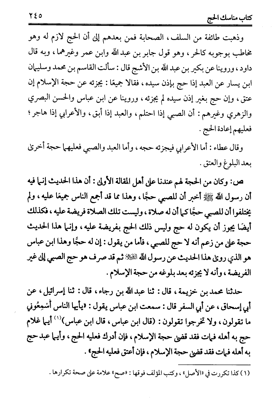 حدثنا محمد بن خزيمة، قال: ثنا عبد الله بن رجاء، قال: ثنا إسرائيل، عن أبي إسحاق، عن أبي السفر قال: سمعت ابن عباس يقول: "يأيها الناس أَسْمِعُوني ما تقولون، ولا تخرجوا تقولون: (قال ابن عباس، قال ابن عباس) (¬1) أيما غلام حج به أهله فمات فقد قضى حجة الإِسلام، فإن أدرك فعليه الحج، وأيما عبد حج به أهله فمات فقد قضى حجة الإِسلام، فإن أعتق فعليه الحج".