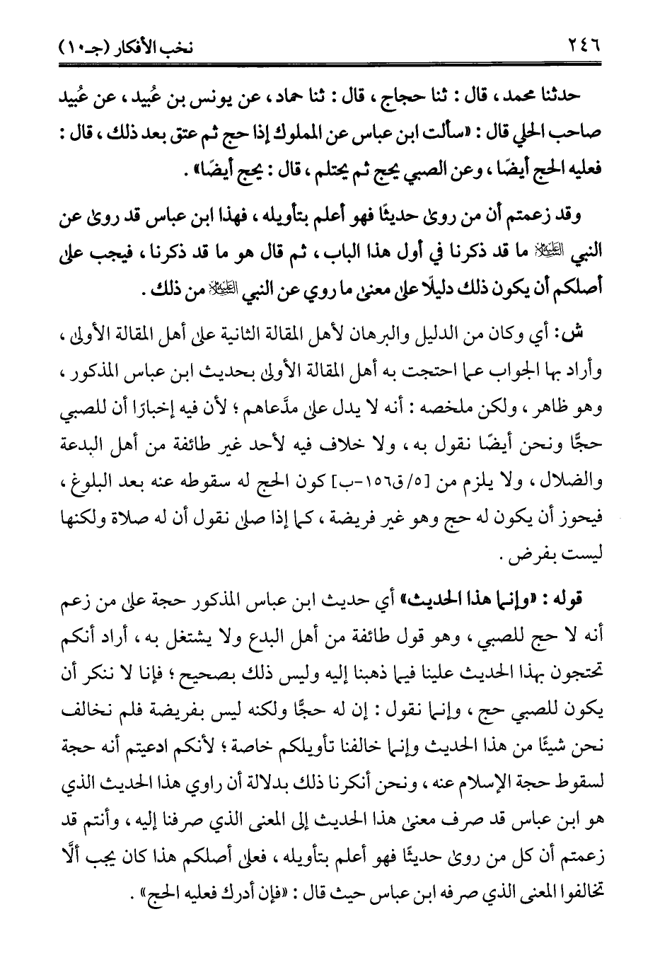 ش: أي وكان من الدليل والبرهان لأهل المقالة الثانية على أهل المقالة الأولى، وأراد بها الجواب عما احتجت به أهل المقالة الأولى بحديث ابن عباس المذكور، وهو ظاهر، ولكن ملخصه: أنه لا يدل على مدَّعاهم؛ لأن فيه إخبارًا أن للصبي حجًّا ونحن أيضًا نقول به، ولا خلاف فيه لأحد غير طائفة من أهل البدعة والضلال، ولا يلزم من كون الحج له سقوطه عنه بعد البلوغ، فيحوز أن يكون له حج وهو غير فريضة، كما إذا صلى نقول أن له صلاة ولكنها ليست بفرض.