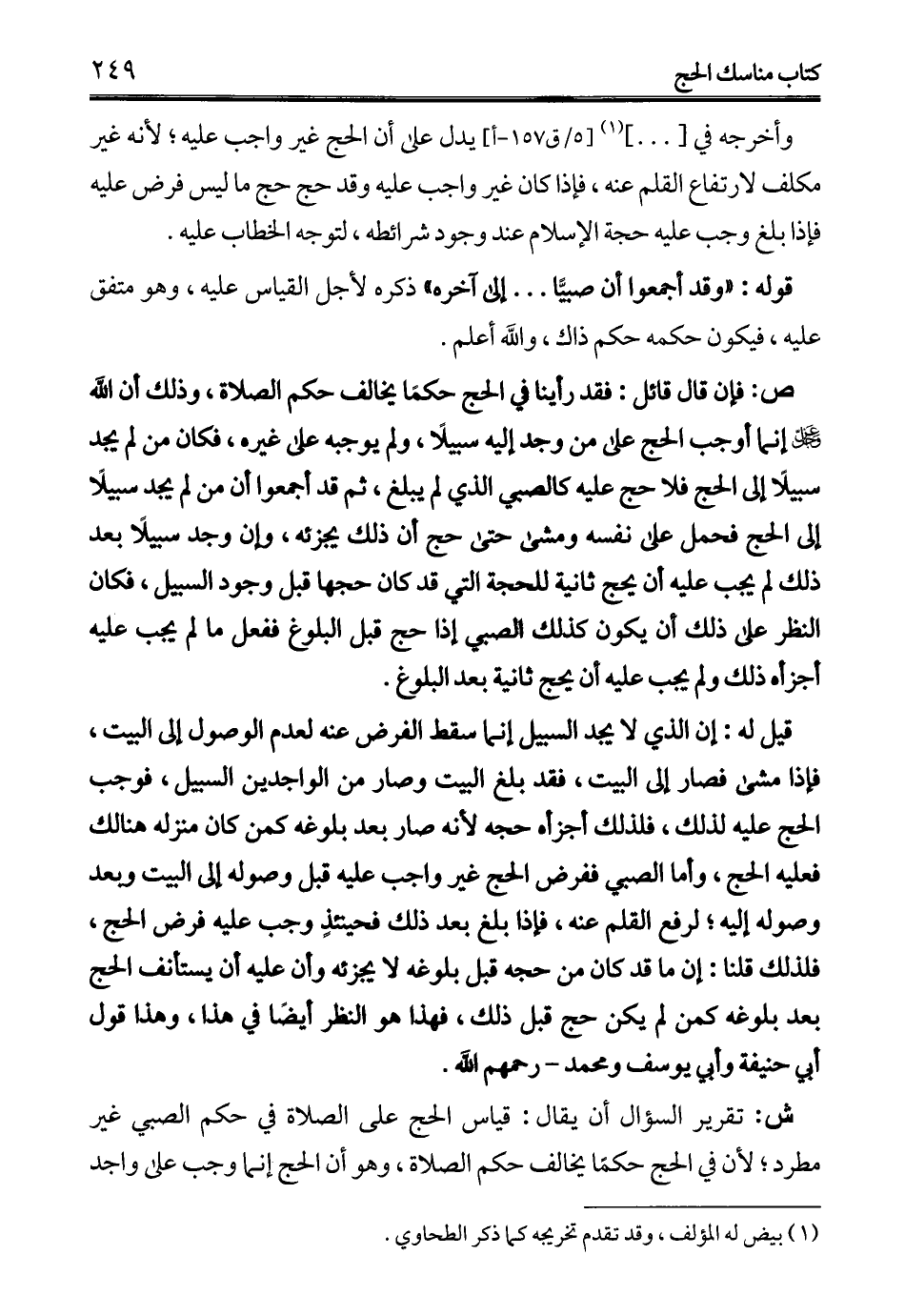 قيل له: إن الذي لا يجد السبيل إنما سقط الفرض عنه لعدم الوصول إلى البيت، فإذا مشى فصار إلى البيت، فقد بلغ البيت وصار من الواجدين السبيل، فوجب الحج عليه لذلك، فلذلك أجزأه حجه لأنه صار بعد بلوغه كمن كان منزله هنالك فعليه الحج، وأما الصبي ففرض الحج غير واجب عليه قبل وصوله لي الييت وبعد وصوله إليه؛ لرفع القلم عنه، فإذا بلغ بعد ذلك فحينئذٍ وجب عليه فرض الحج، فلذلك قلنا: أن ما قد كان من حجه قبل بلوغه لا يجزئه وأن عليه أن يستأنف الحج بعد بلوغه كمن لم يكن حج قبل ذلك، فهذا هو النظر أيضًا في هذا، وهذا قول أبي حنيفة وأبي يوسف ومحمد -رحمهم الله-.