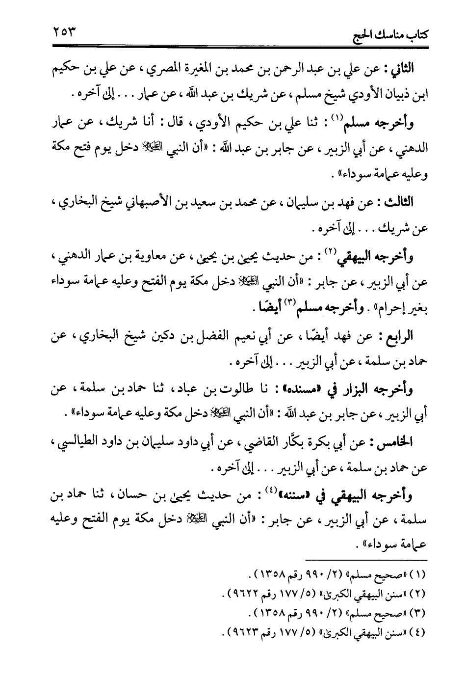 وأخرجه البزار في "مسنده": نا طالوت بن عباد، ثنا حماد بن سلمة، عن أبي الزبير، عن جابر بن عبد الله: "أن النبي -عليه السلام- دخل مكة وعليه عمامة سوداء".
