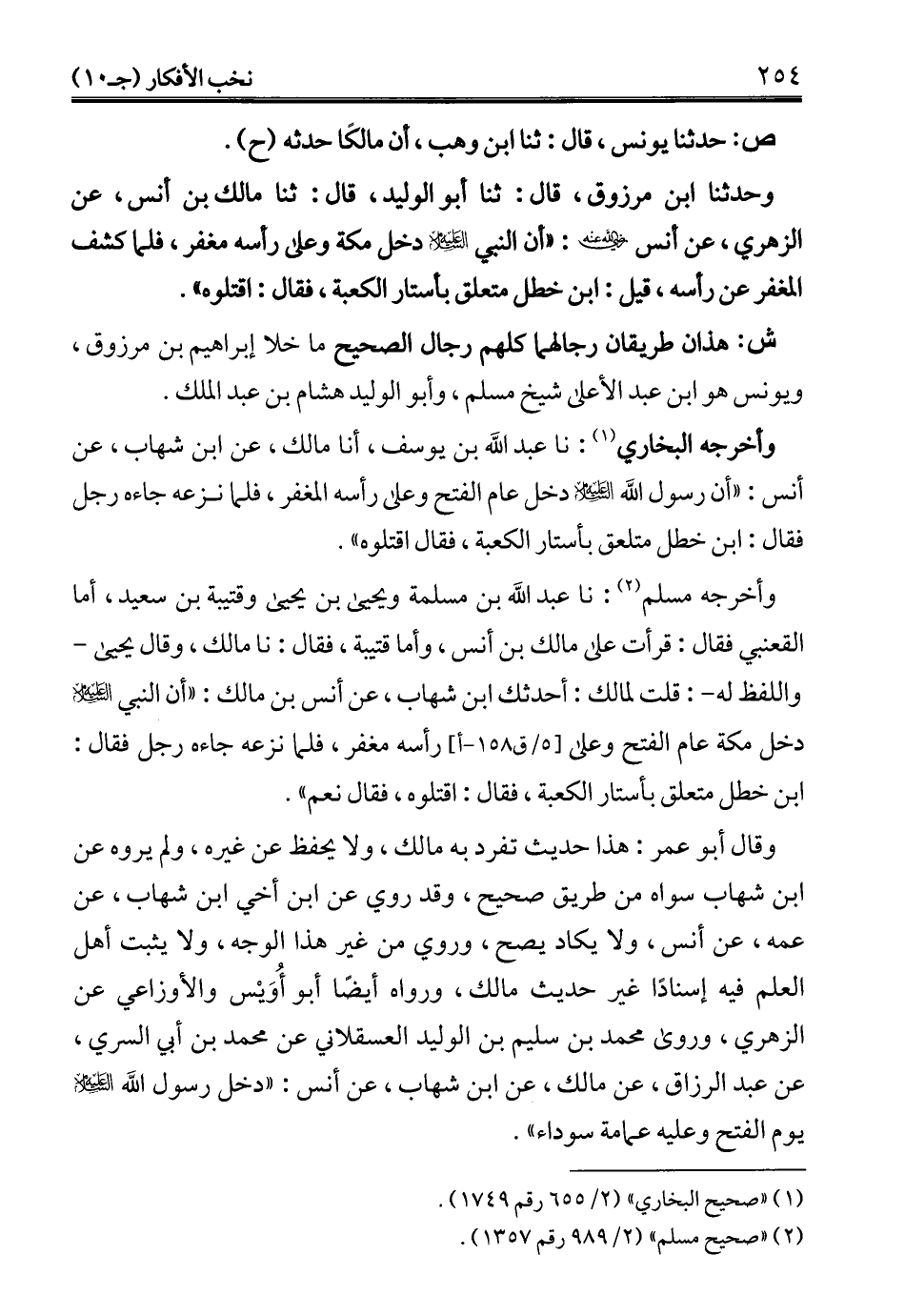 وحدثنا ابن مرزوق، قال: ثنا أبو الوليد، قال: ثنا مالك بن أنس، عن الزهري، عن أنس -رضي الله عنه-: "أن النبي -عليه السلام- دخل مكة وعلى رأسه مغفر، فلما كشف المغفر عن رأسه، قيل: ابن خطل متعلق بأستار الكعبة، فقال: اقتلوه".