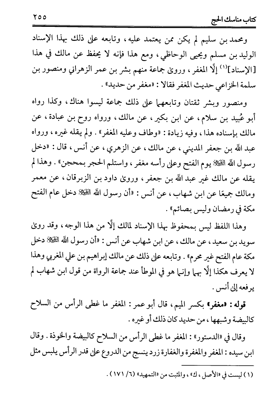 ومحمد بن سليم لم يكن ممن يعتمد عليه، وتابعه على ذلك بهذا الإِسناد الوليد بن مسلم ويحيى الوحاظي، ومع هذا فإنه لا يحفظ عن مالك في هذا [الإِسناد] (¬1) إلاَّ المغفر، وروى جماعة منهم بشر بن عمر الزهراني ومنصور بن سلمة الخزاعي حديث المغفر فقالا: "مغفر من حديد".