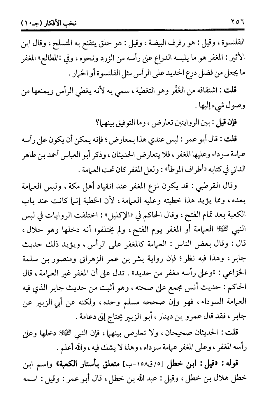 وقال القرطبي: قد يكون نزع المغفر عند انقياد أهل مكة، ولبس العمامة بعده، ومما يؤيد هذا خطبته وعليه العمامة، لأن الخطبة إنما كانت عند باب الكعبة بعد تمام الفتح، وقال الحاكم في "الإِكليل": اختلفت الروايات في لبس النبي -عليه السلام- العمامة أو المغفر يوم الفتح، ولم يختلفوا أنه دخلها وهو حلال، قال: وقال بعض الناس: العمامة كالمغفر على الرأس، ويؤيد ذلك حديث جابر، وهذا فيه نظر؛ فإن رواية بشر بن عمر الزهراني ومنصور بن سلمة الخزاعي: "وعلى رأسه مغفر من حديد". تدل على أن المغفر غير العمامة، قال الحاكم: حديث أنس مجمع على صحته، وهو أثبت من حديث جابر الذي فيه العمامة السوداء، فهو وإن صححه مسلم وحده، ولكنه عن أبي الزبير عن جابر، فقد قال عمرو بن دينار، أبو الزبير يحتاج إلى دعامة.