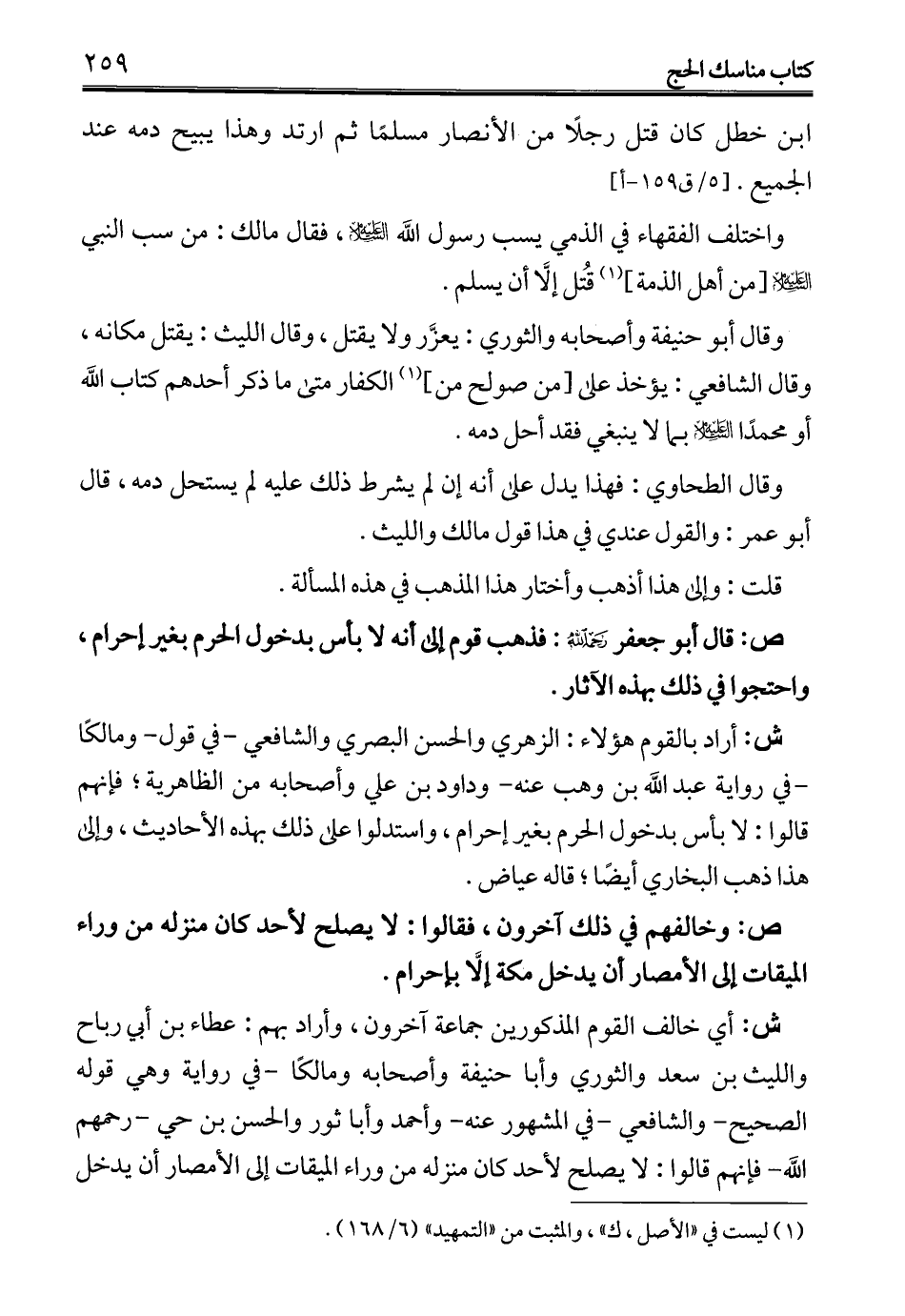 ش: أي خالف القوم المذكورين جماعة آخرون، وأراد بهم: عطاء بن أبي رباح والليث بن سعد والثوري وأبا حنيفة وأصحابه ومالكًا -في رواية وهي قوله الصحيح- والشافعي -في المشهور عنه- وأحمد وأبا ثور والحسن بن حي -رحمهم الله- فإنهم قالوا: لا يصلح لأحد كان منزله من وراء الميقات إلى الأمصار أن يدخل