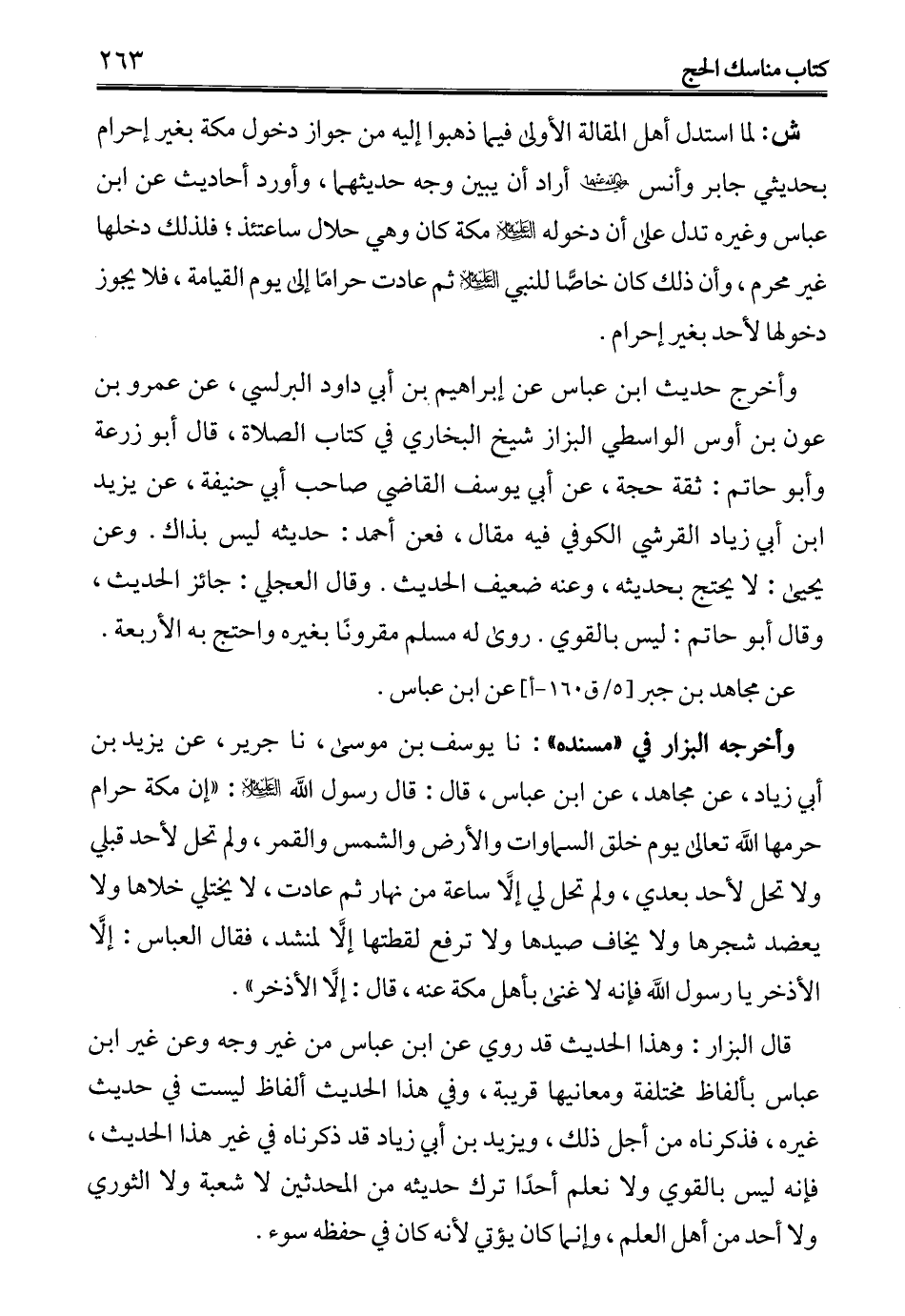 وأخرجه البزار في "مسنده": نا يوسف بن موسى، نا جرير، عن يزيد بن أبي زياد، عن مجاهد، عن ابن عباس، قال: قال رسول الله -عليه السلام-: "إن مكة حرام حرمها الله تعالى يوم خلق السماوات والأرض والشمس والقمر، ولم تحل لأحد قبلي ولا تحل لأحد بعدي، ولم تحل لي إلاَّ ساعة من نهار ثم عادت، لا يختلي خلاها ولا يعضد شجرها ولا يخاف صيدها ولا ترفع لقطتها إلاَّ لمنشد، فقال العباس: إلاَّ الأذخر يا رسول الله فإنه لا غنى بأهل مكة عنه، قال: إلاَّ الأذخر".