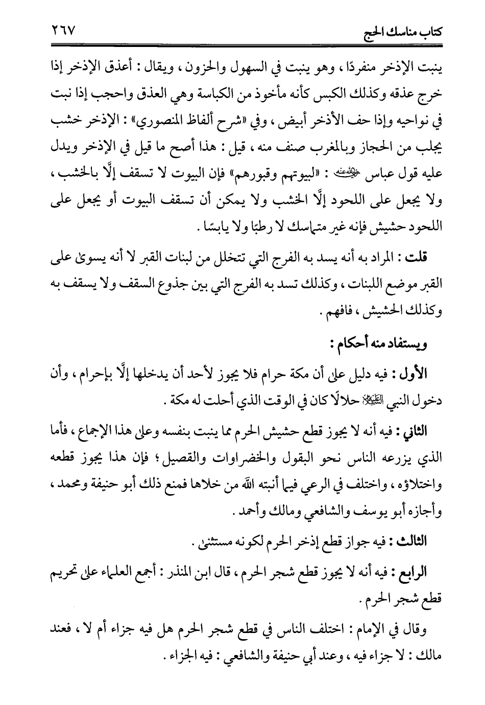 الثاني: فيه أنه لا يجوز قطع حشيش الحرم مما ينبت بنفسه وعلى هذا الإِجماع، فأما الذي يزرعه الناس نحو البقول والخضراوات والقصيل؛ فإن هذا يجوز قطعه واختلاؤه، واختلف في الرعي فيما أنبته الله من خلاها فمنع ذلك أبو حنيفة ومحمد، وأجازه أبو يوسف والشافعي ومالك وأحمد.