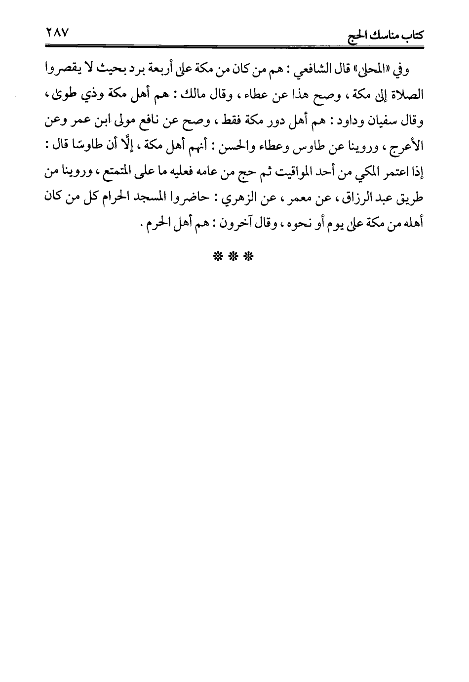 وفي "المحلى" قال الشافعي: هم من كان من مكة على أربعة برد بحيث لا يقصروا الصلاة إلى مكة، وصح هذا عن عطاء، وقال مالك: هم أهل مكة وذي طوى، وقال سفيان وداود: هم أهل دور مكة فقط، وصح عن نافع مولى ابن عمر وعن الأعرج، وروينا عن طاوس وعطاء والحسن: أنهم أهل مكة، إلاَّ أن طاوساً قال: إذا اعتمر المكي من أحد المواقيت ثم حج من عامه فعليه ما على المتمتع، وروينا من طريق عبد الرزاق، عن معمر، عن الزهري: حاضروا المسجد الحرام كل من كان أهله من مكة على يوم أو نحوه، وقال آخرون: هم أهل الحرم.