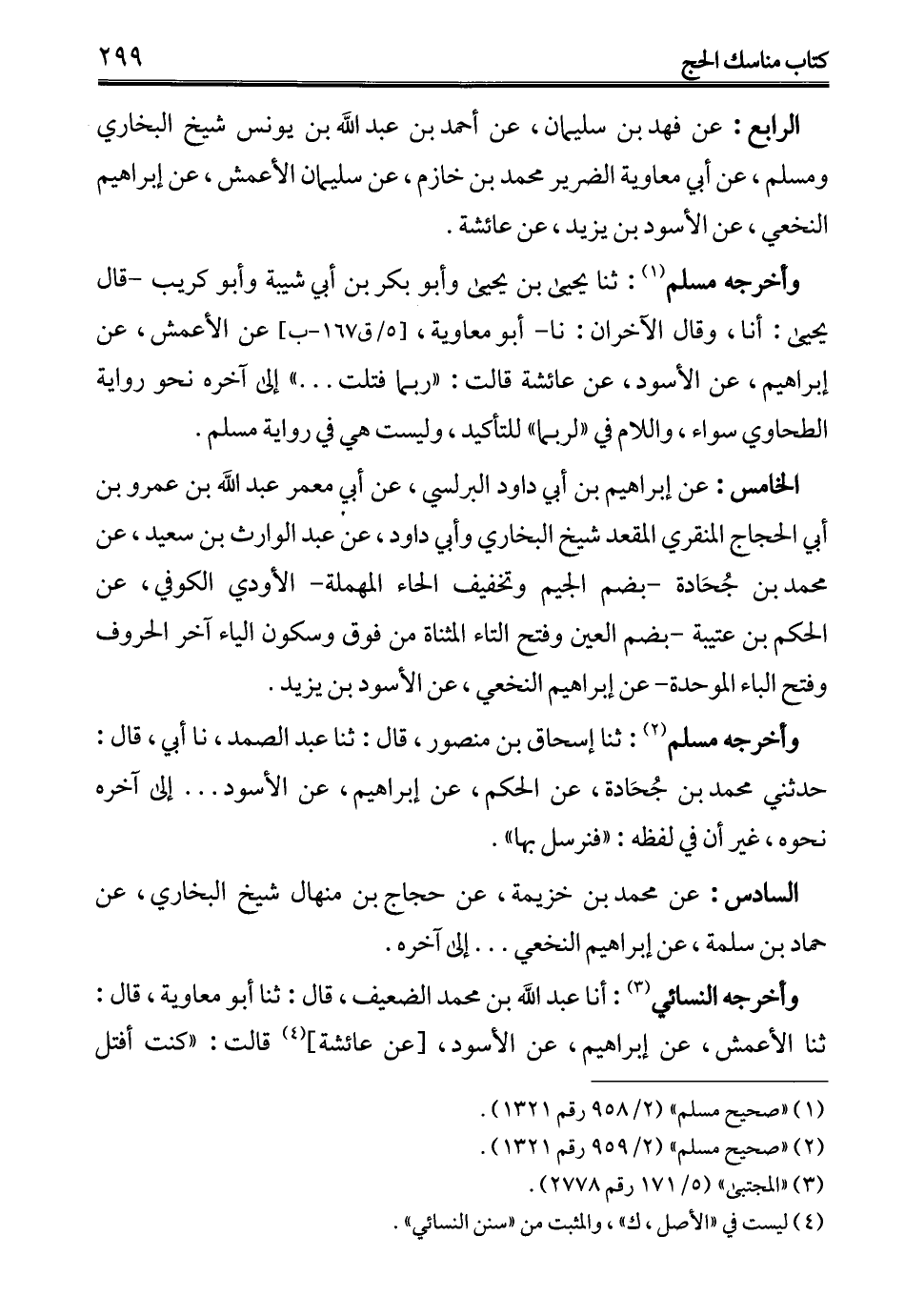 الرابع: عن فهد بن سليمان، عن أحمد بن عبد الله بن يونس شيخ البخاري ومسلم، عن أبي معاوية الضرير محمد بن خازم، عن سليمان الأعمش، عن إبراهيم النخعي، عن الأسود بن يزيد، عن عائشة.