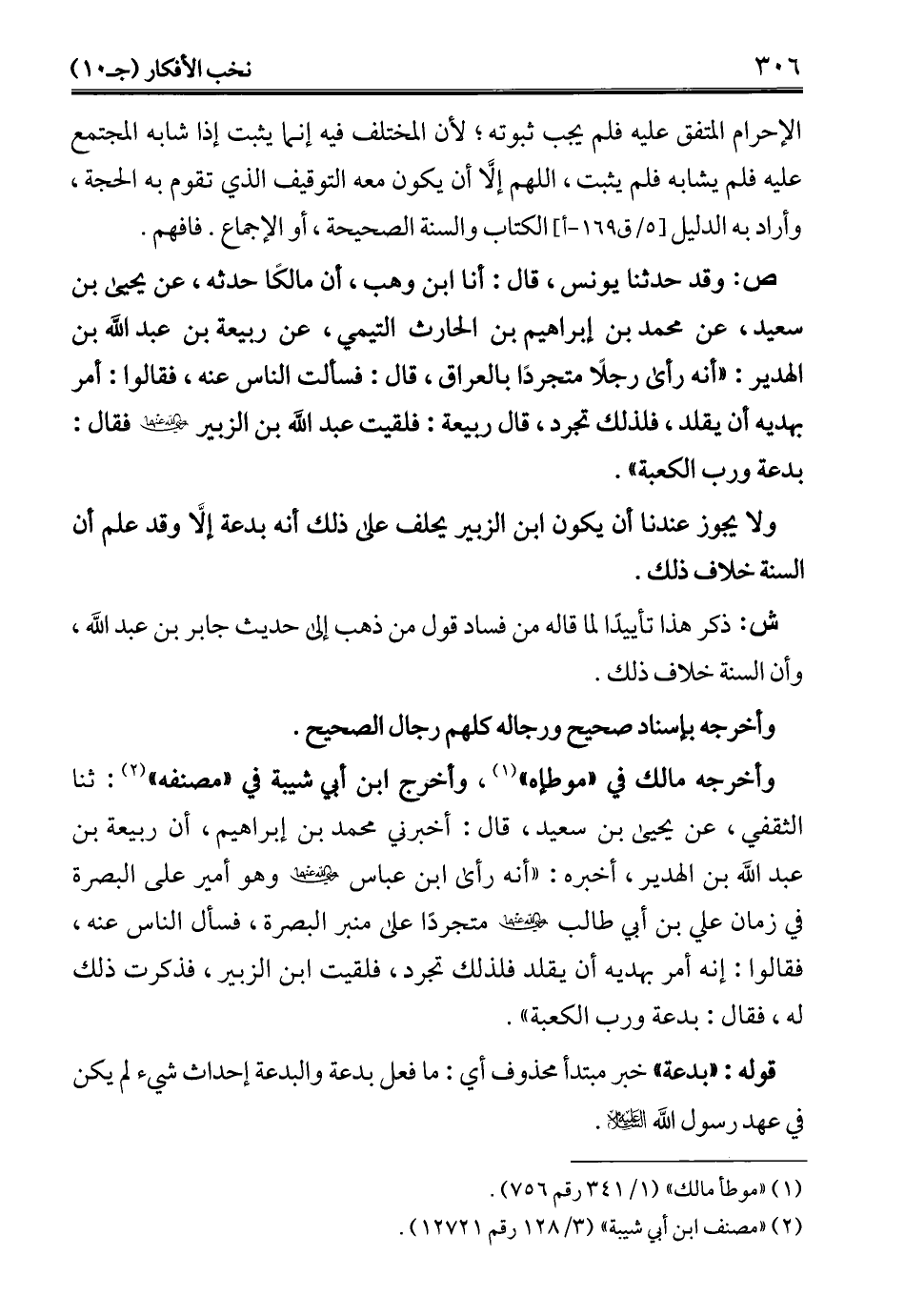 ص: وقد حدثنا يونس، قال: أنا ابن وهب، أن مالكًا حدثه، عن يحيى بن سعيد، عن محمد بن إبراهيم بن الحارث التيمي، عن ربيعة بن عبد الله بن الهدير: "أنه رأى رجلاً متجردًا بالعراق، قال: فسألت الناس عنه، فقالوا: أمر بهديه أن يقلد، فلذلك تجرد، قال ربيعة: فلقيت عبد الله بن الزبير -رضي الله عنهما- فقال: بدعة ورب الكعبة".